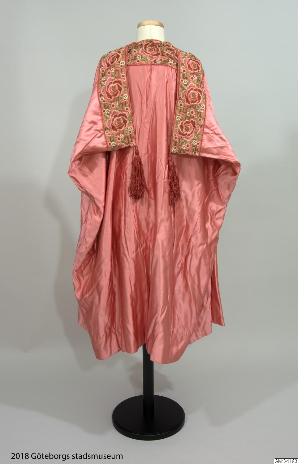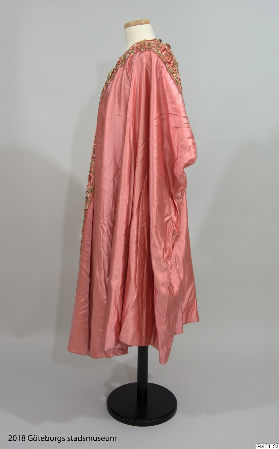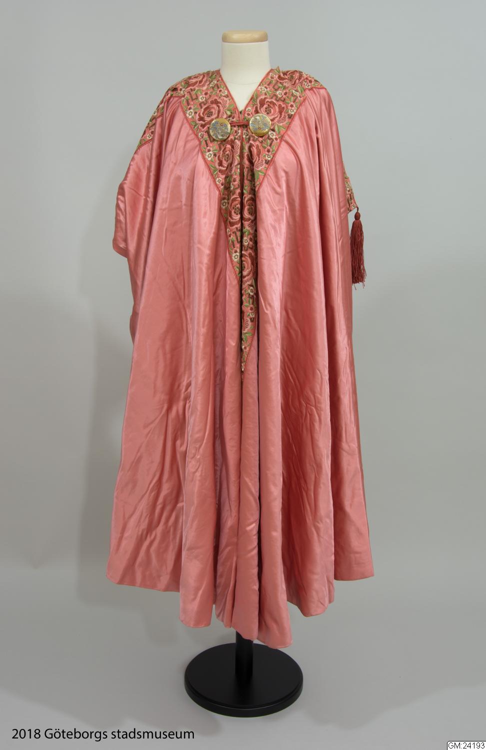 • Från katalogkort: Aftonkappa i burnusmodell av skärt siden. Axlar och framkanter är garnerade med rosa sidenband (bredd 11 cm) med blommönster i olika nyanser av rosa och grönt broderat i silke och guldtråd. Knäppes med två porslinsknappar med japanskt motiv samt röd ögla av flätat rött silke. En röd silketofs på varje axel. Längd bak: 114 cm. Firmamärke Liberty & Co London & Paris.