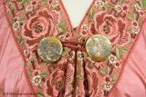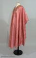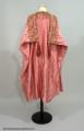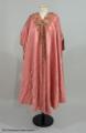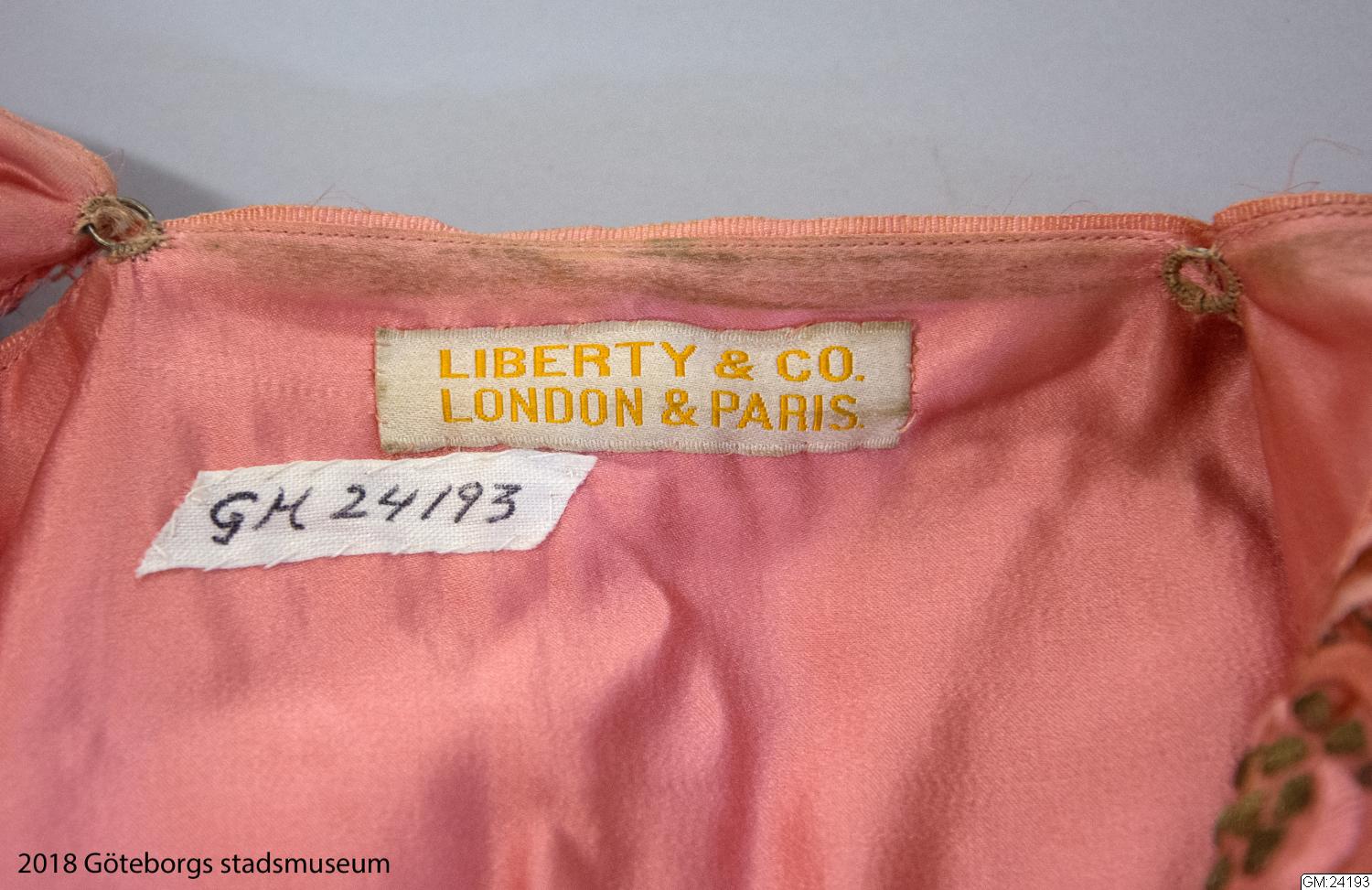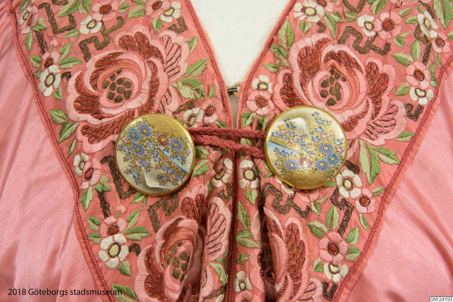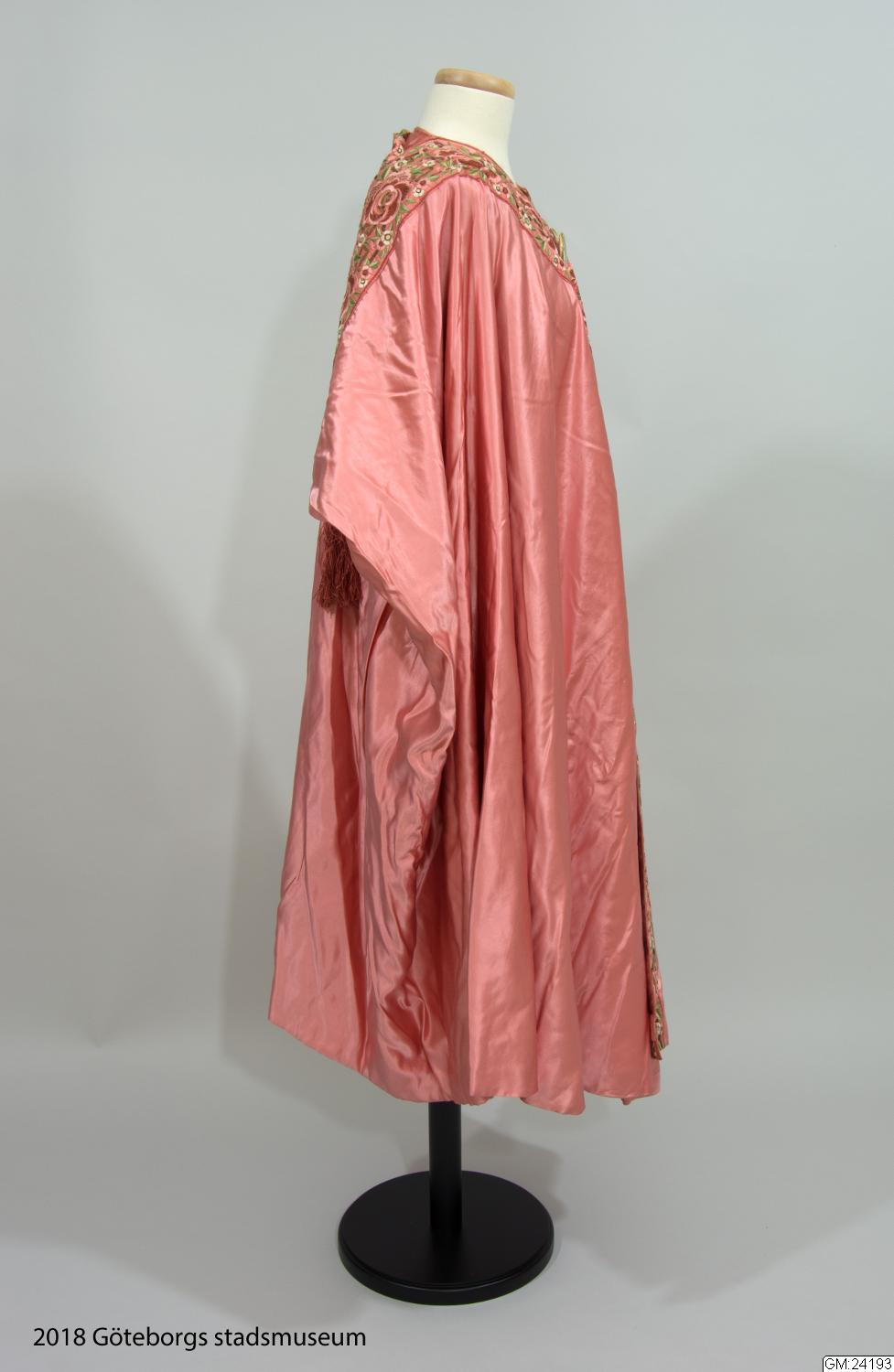 • Från katalogkort: Aftonkappa i burnusmodell av skärt siden. Axlar och framkanter är garnerade med rosa sidenband (bredd 11 cm) med blommönster i olika nyanser av rosa och grönt broderat i silke och guldtråd. Knäppes med två porslinsknappar med japanskt motiv samt röd ögla av flätat rött silke. En röd silketofs på varje axel. Längd bak: 114 cm. Firmamärke Liberty & Co London & Paris.