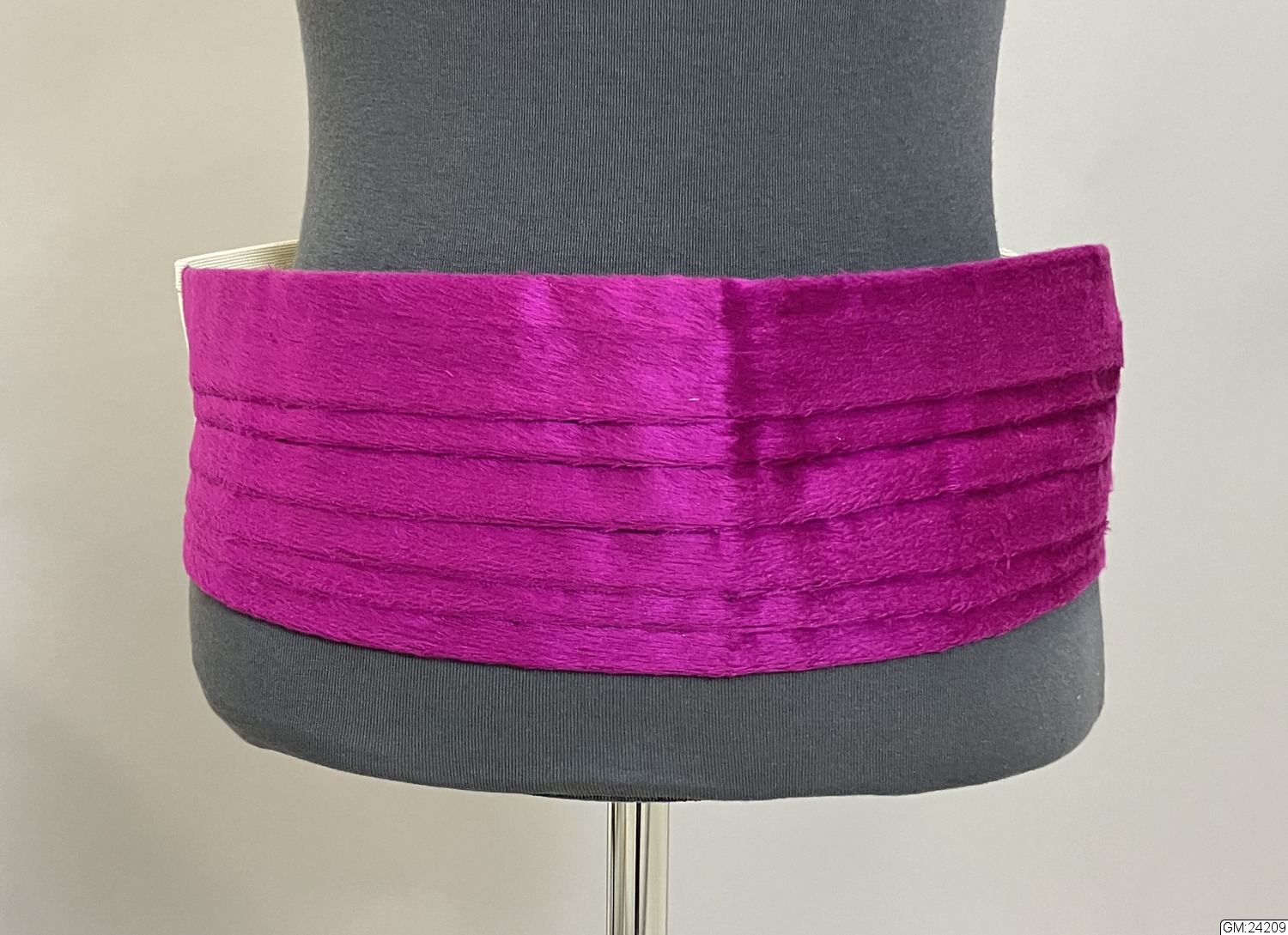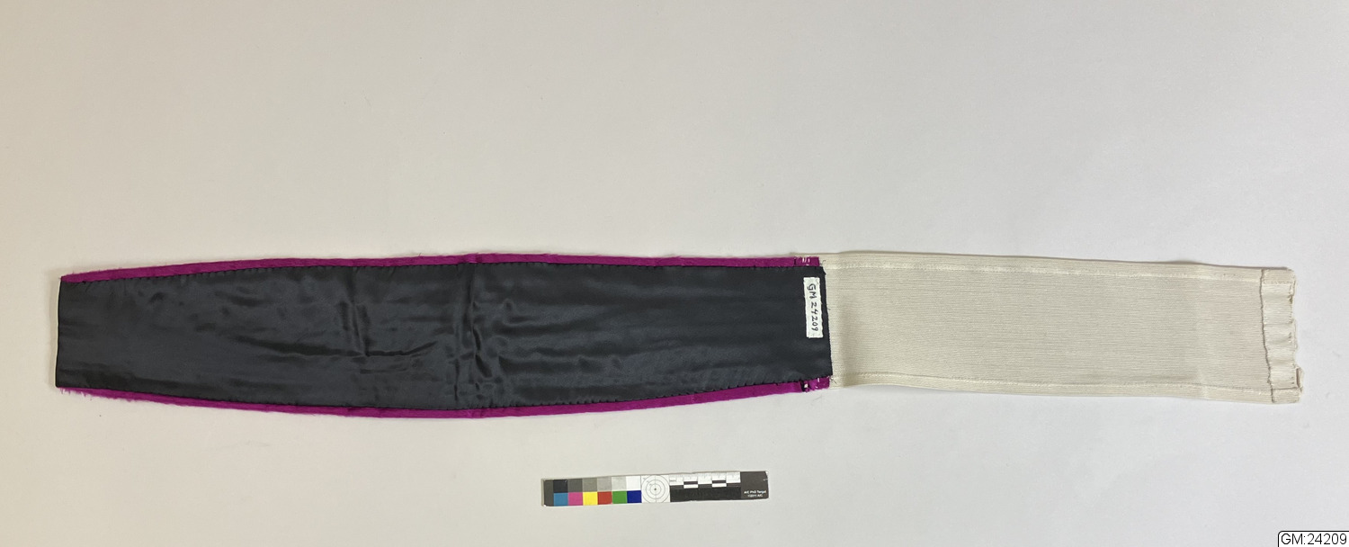 • Från katalogkort: Skärp av violett (cerise) silkesfelb och resår. Bredd 9,5-12 cm