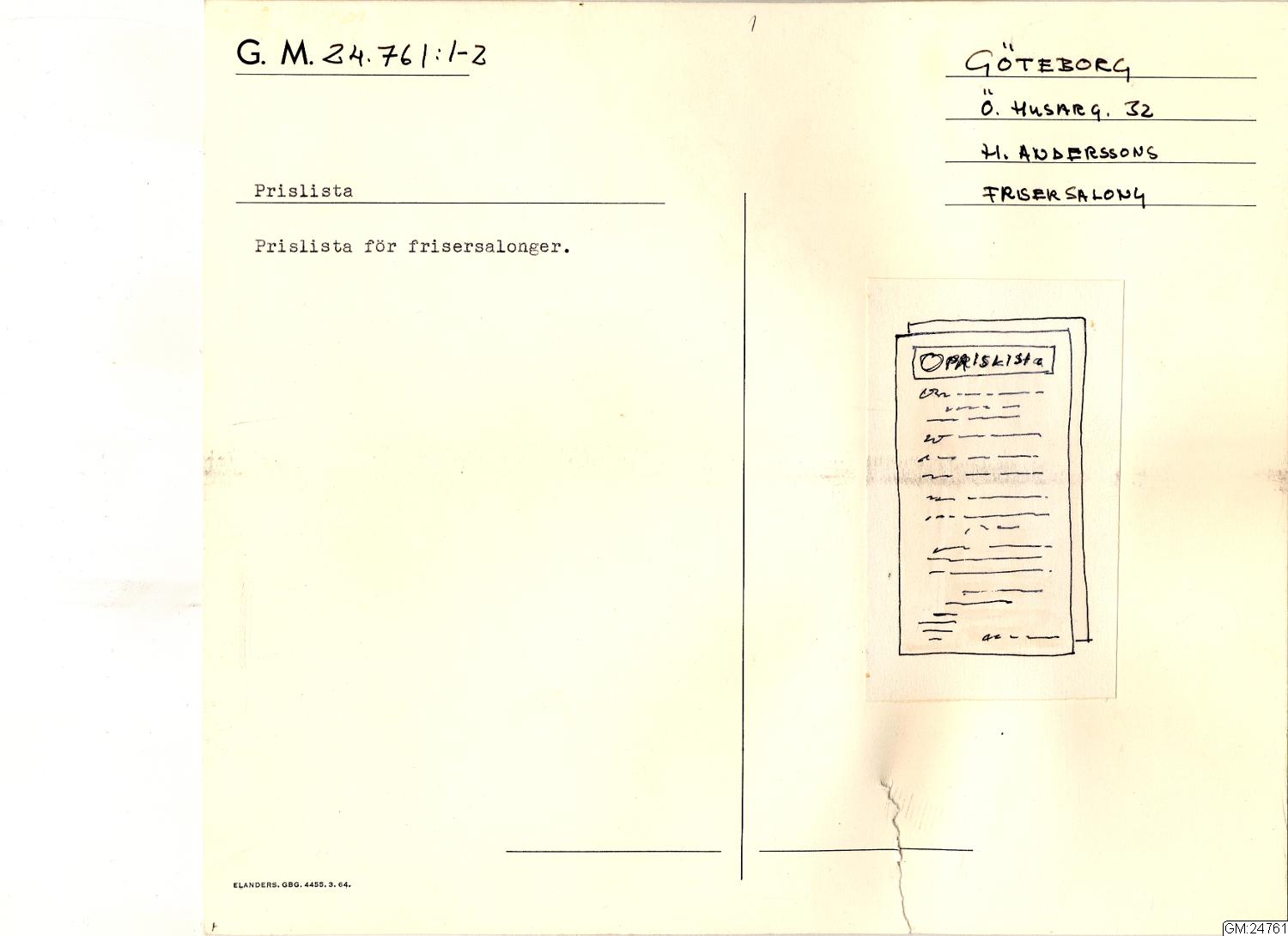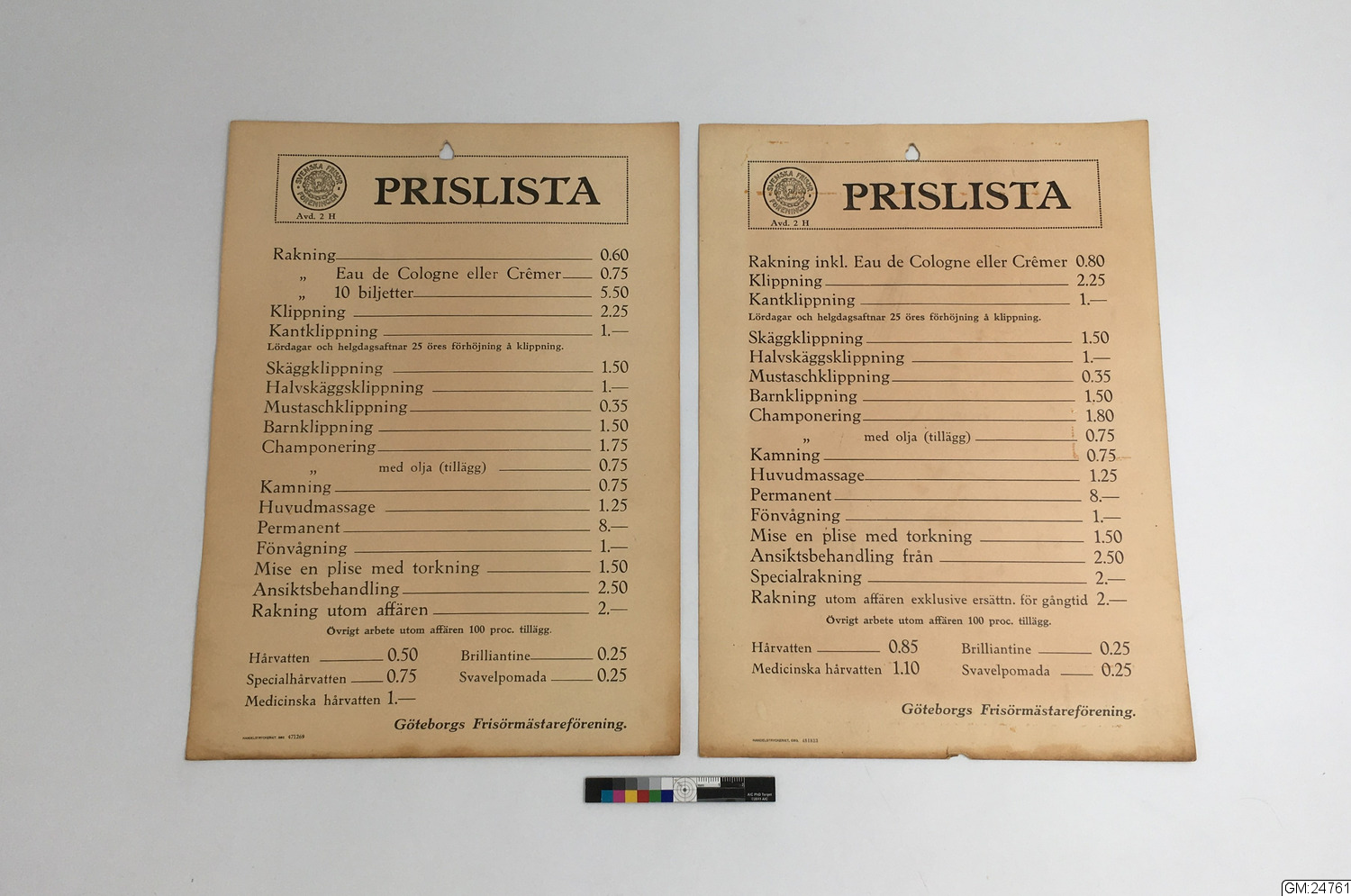 • Två prislistor från en frisörsalong med prisuppgifter för klippning, rakning mm.