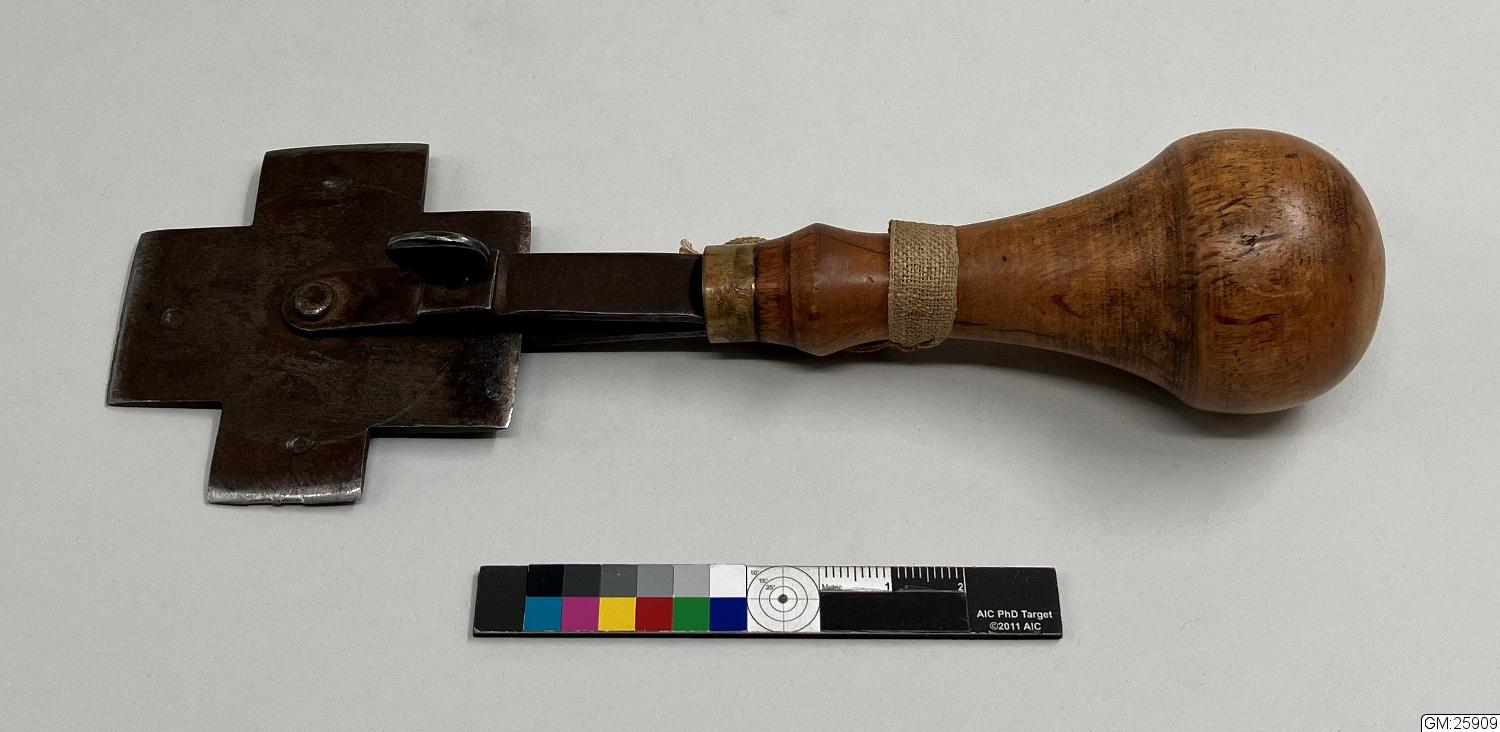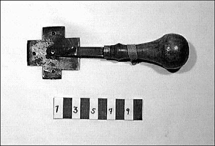 • Knapphålsstans av järn med svarvat trähandtag. Möjligheter till fyra olika knapphålsstorlekar.