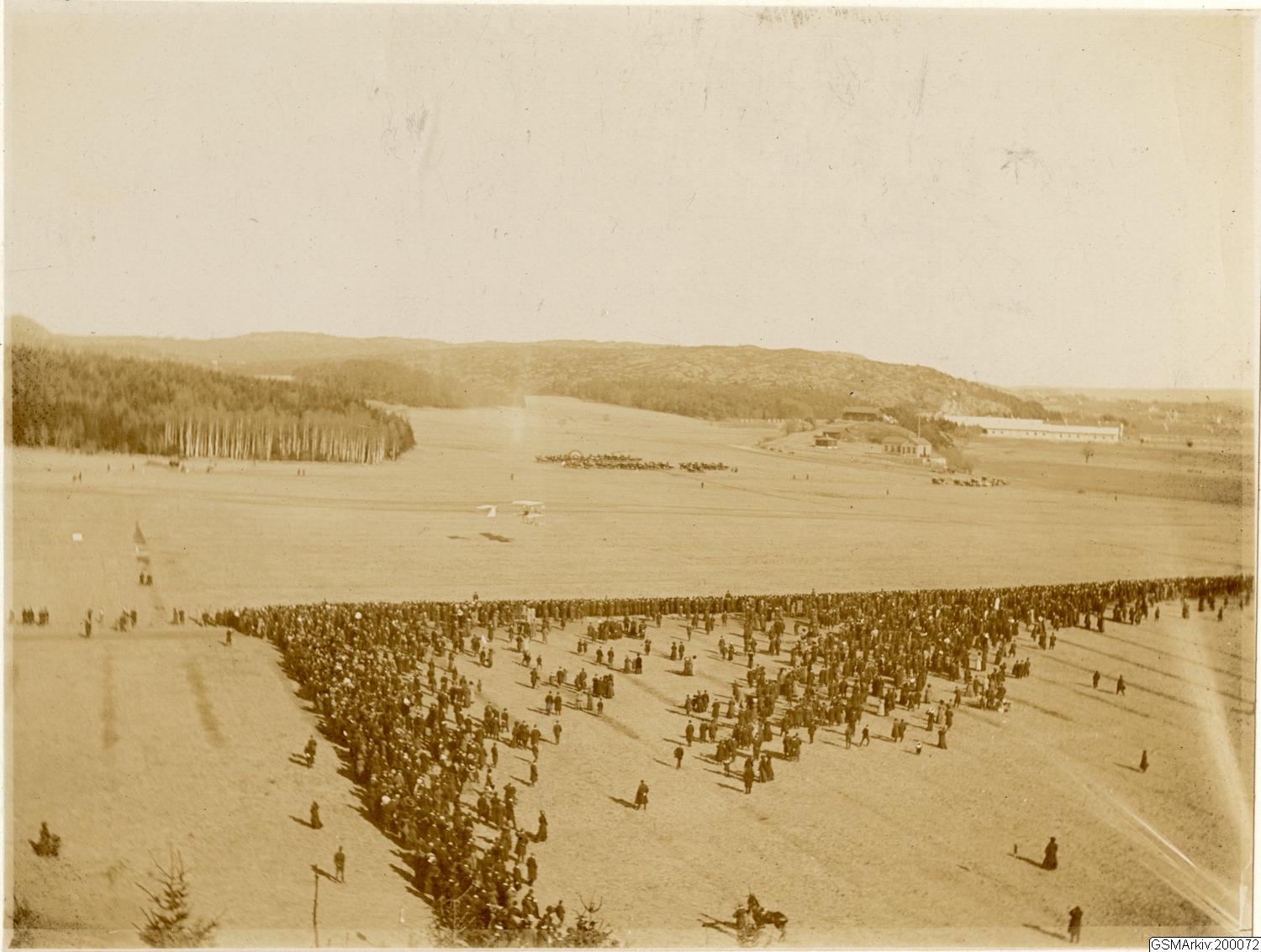 • Delar av publiken vid Göteborgs första flyguppvisning i mars 1911, när flygaren René Coziic gästade Göteborg med sitt flygplan. Det rapporterades att 10 000 till 150 00 besökte evenemanget vid Kviberg.