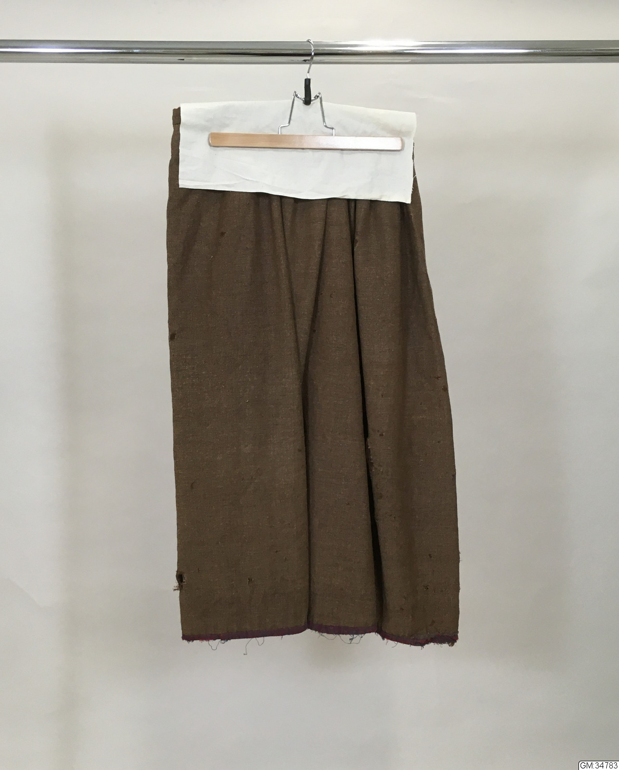 Kjol av brunt ylletyg med 2,5 cm bred linning vid vilken kjolen är fäst med lagda veck baktill. Mitt bak sprund med hake och hyska. Nedtill kant av lila bomullstyg.