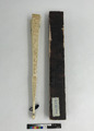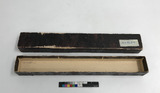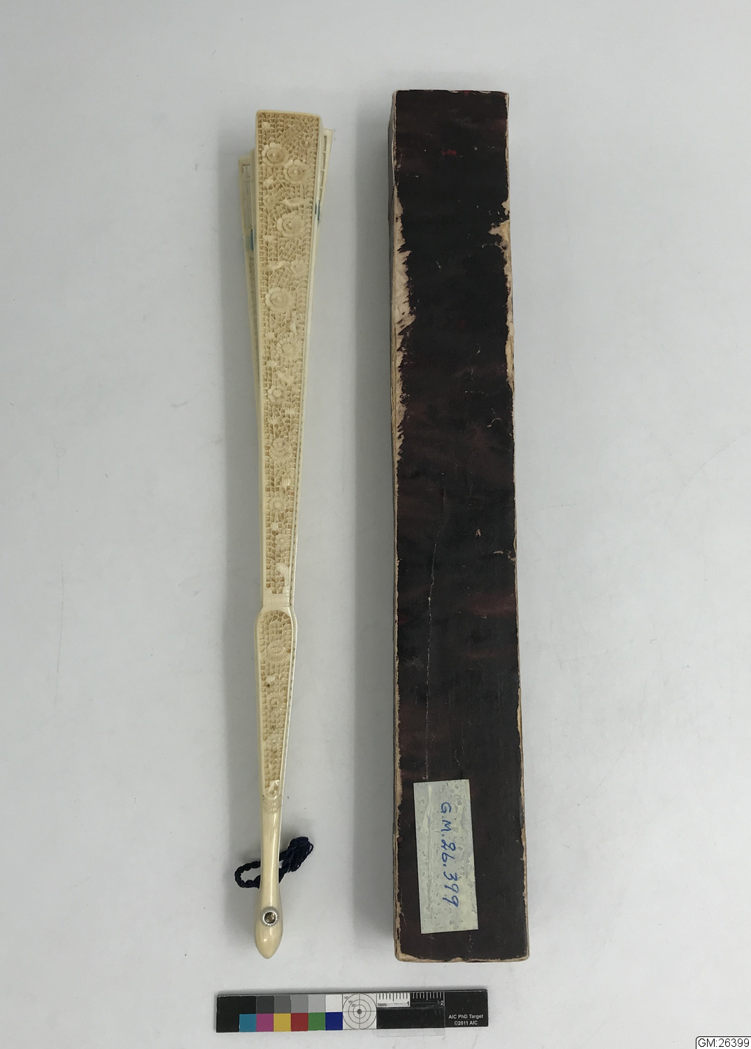 • Solfjäder i utskuren tunn elfenben, sammanhållen med blått sidenband. Ligger i ett etui av papp.