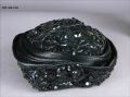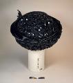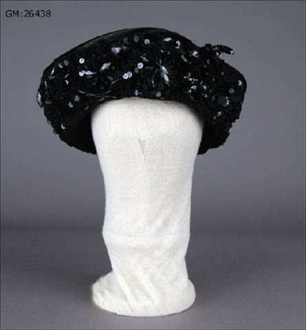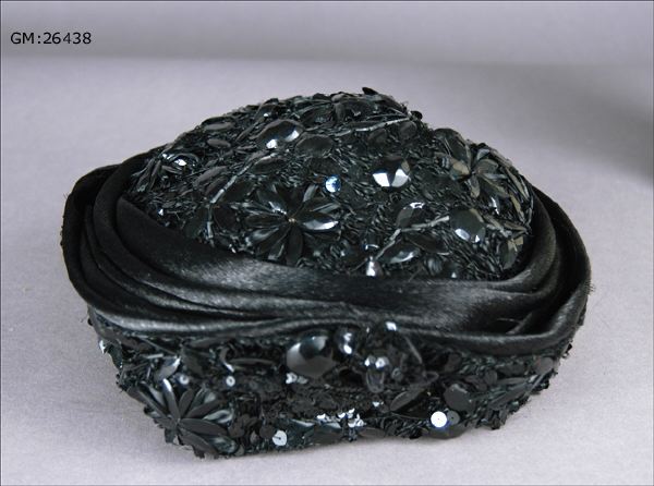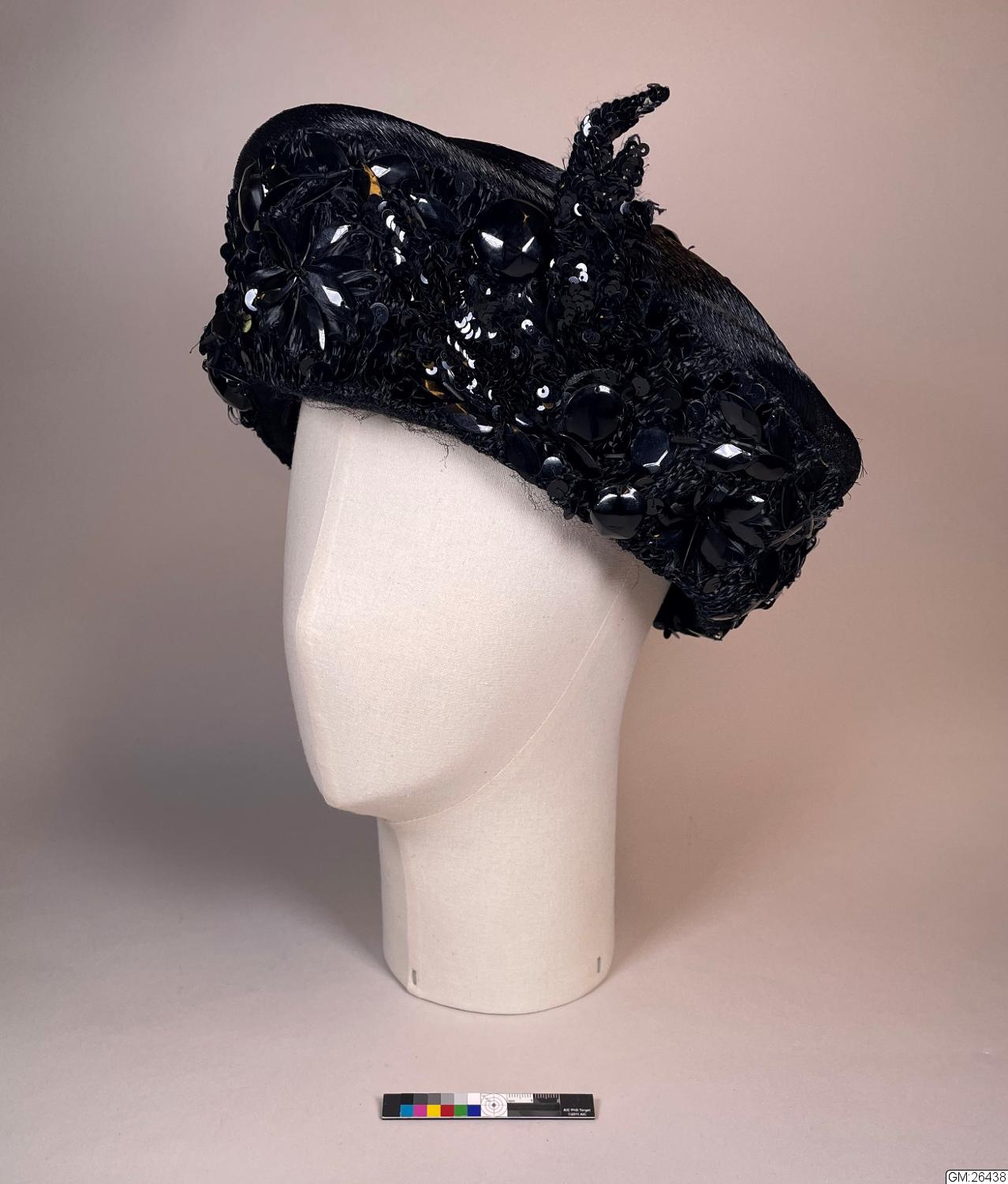 Damhatt för sorgklädsel från cirka 1905. Etikettsreglerna för sorgdräkt var rigorösa, denna hatt av draperad tagelväv, har paljetter som imiterar jet, de glittrar och blänker. Sådant kunde inte bäras till djup sorg, när allt i dräkten skulle vara svart och matt. Däremot kunde en änka som fortsatte bära svart efter det första sorgeåret tillåta sig detta. Hatten är från en Stockholmsatelje "Stina Löf"