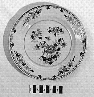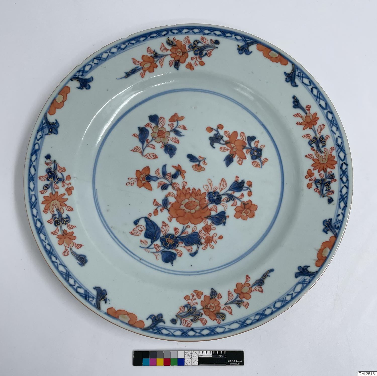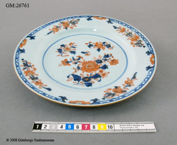• Flat tallrik. Målad blomdekor i blått, rött och guld.