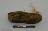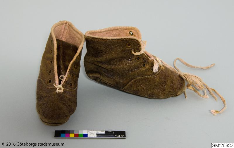 Från katalogkort: Barnskor1 par L. 13 cm H. 7 cm av brunt skinn med 5 st par snörhål. Fodrade med rosa flanell. Under ena sulan: "Lilla Ingrids första kängor". Omkr 1910