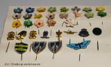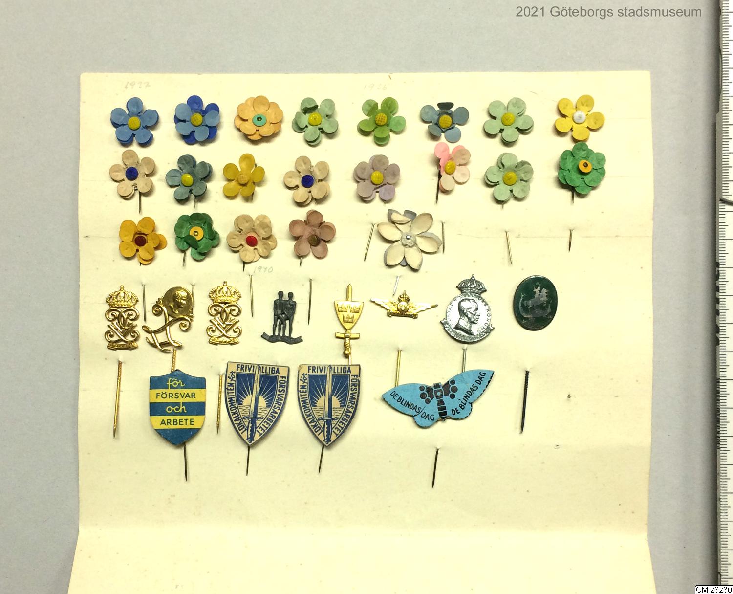 • Karta med en samling förstamajblommor och pins/märken. Gåva från Annie Lindgren 1971.