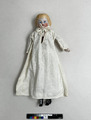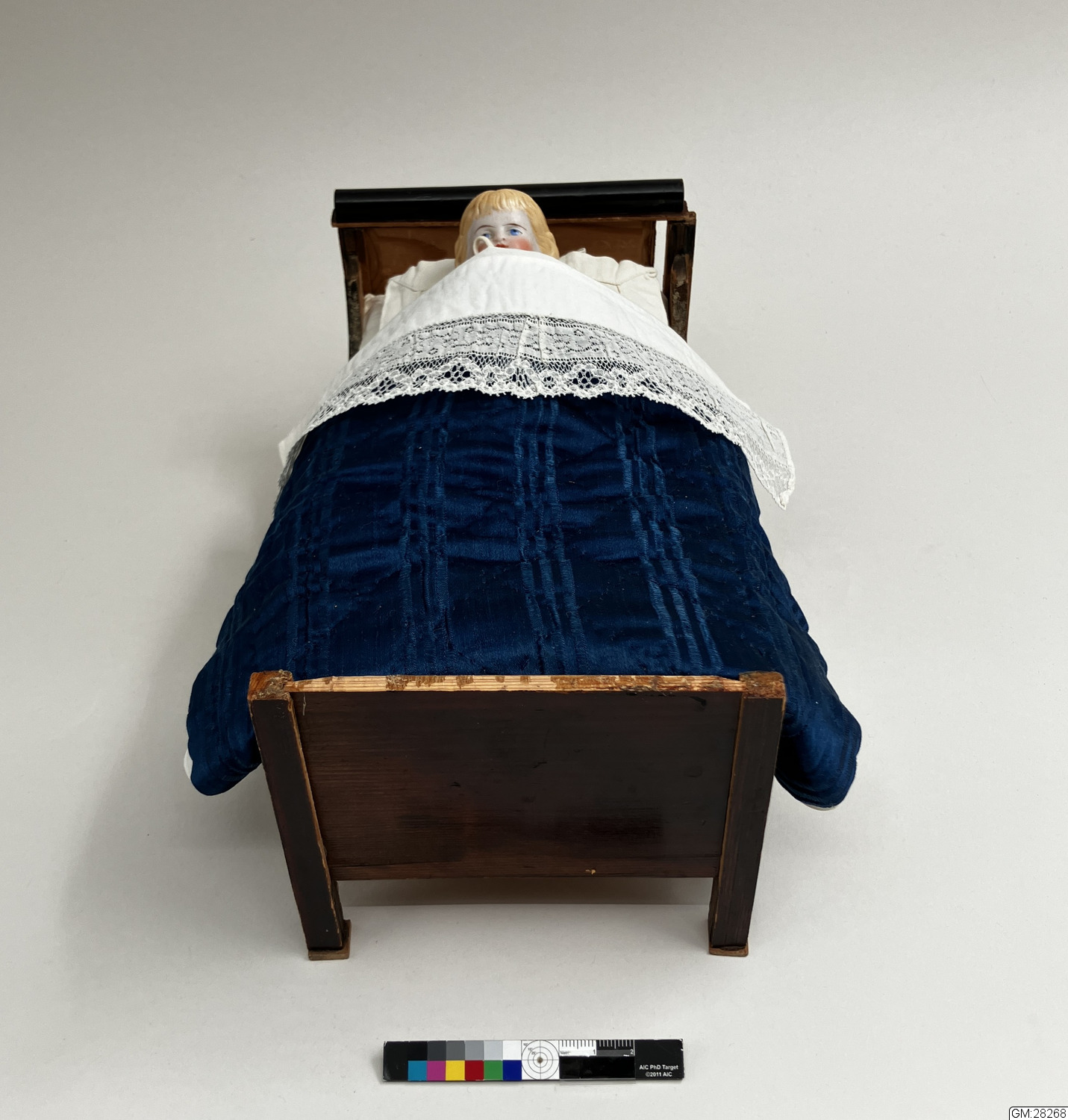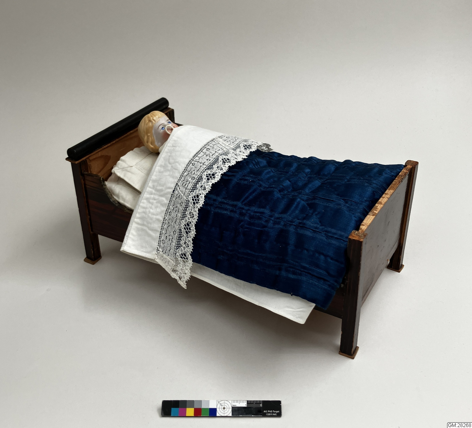 Docka med docksäng. Dockan med huvud, armar och men i porslin och kropp i stoppad textil. Dockan har benkläder med spets i bensluten och nattsärk, i bomull. Säng i trä med madrass, två kuddar med örngott, underlakan, lakan och täcke.