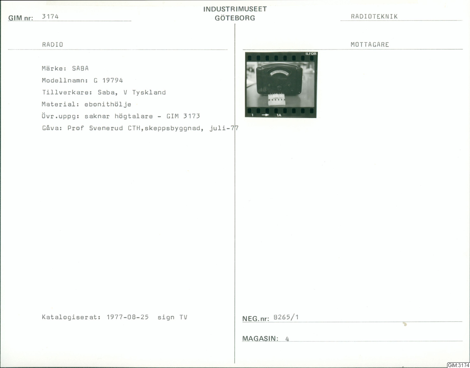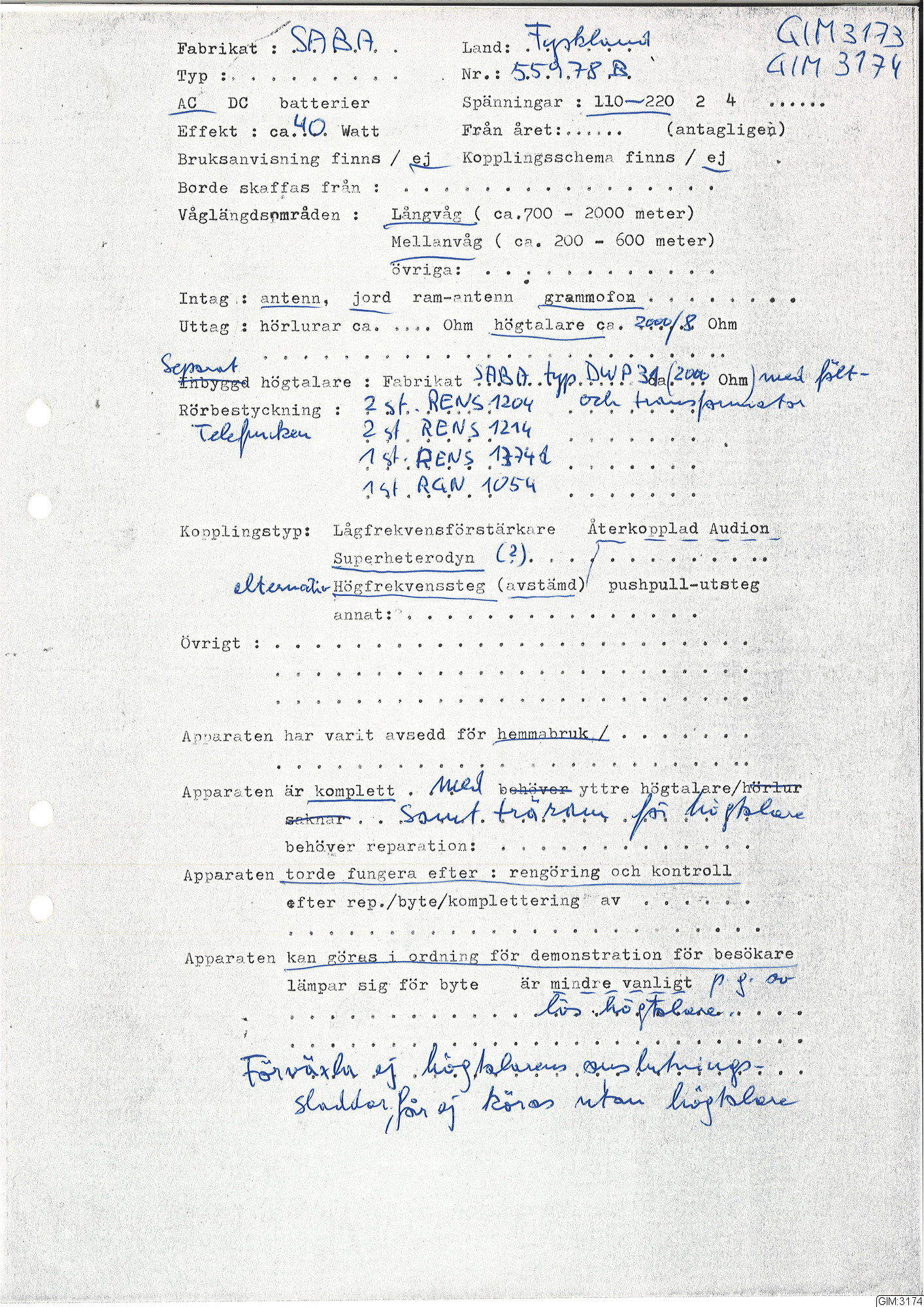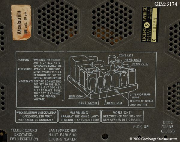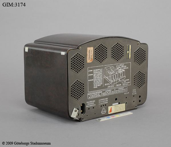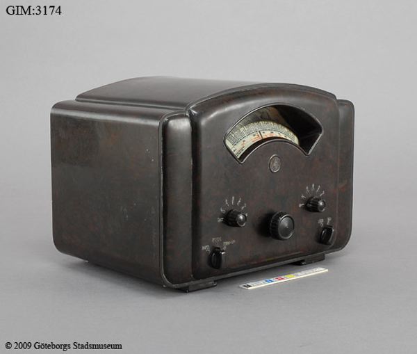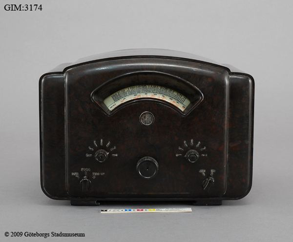 Mottagare rörbestyckad. LV - MV. Chassie och reglage i bakelit. Nätsladd. Bakstycke i papp. Separat högtalare. Stationsskala utan fönster. Skador: smårepor runt om.