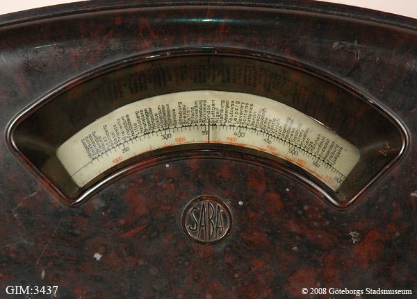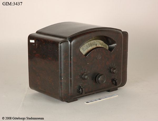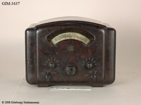 Rundradiomottagare rörbestyckad LV - MV. Brunt bakelitchassie. Stationsskala i plast. Bakelitreglage. Skador: Bakstycke saknas. Bit av chassie borta på höger sida. Smårepor runt om.