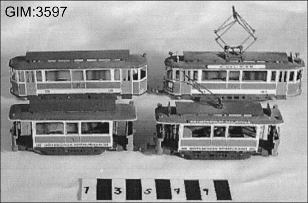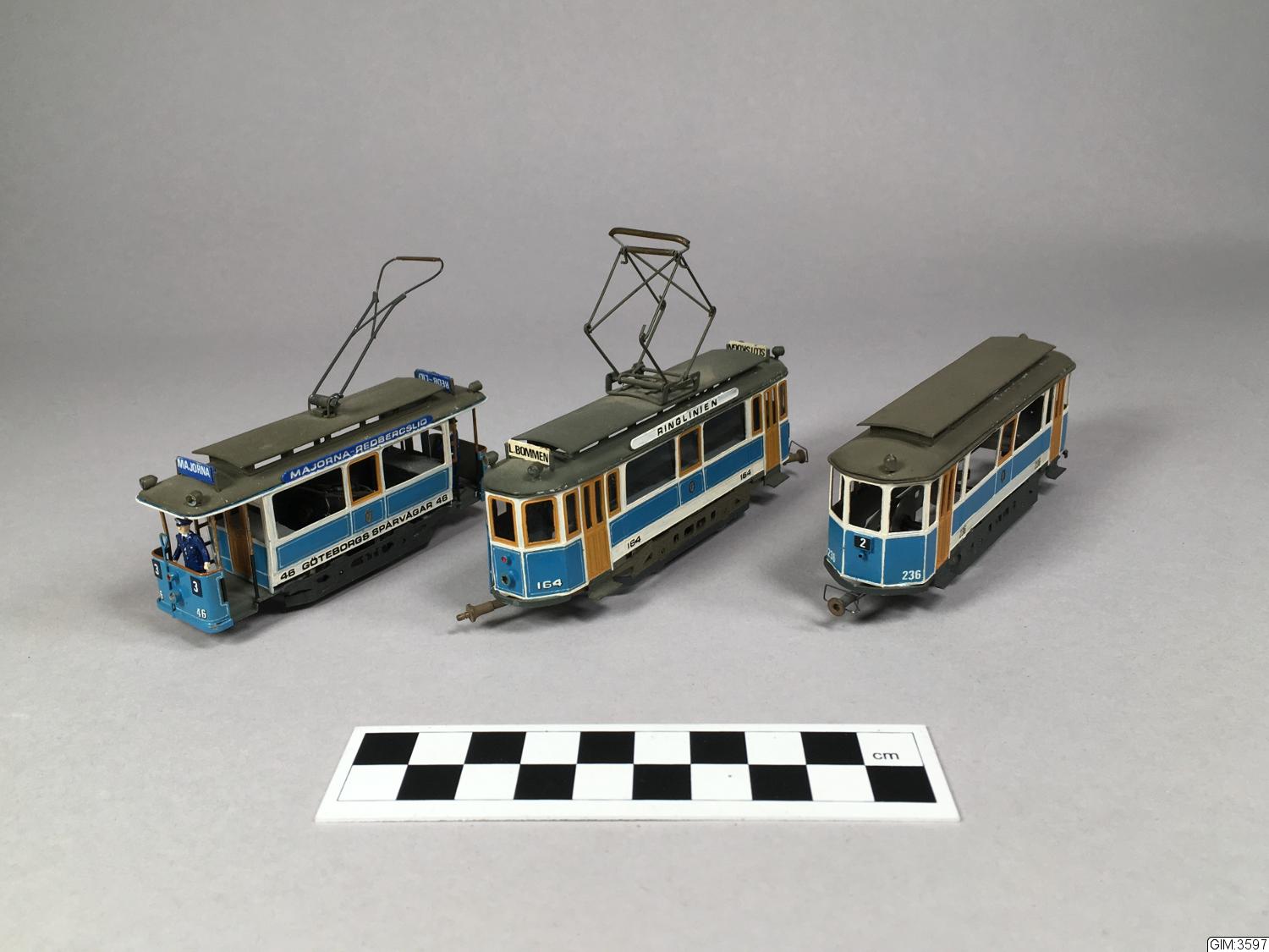 Modellspårvagnar i skala HO (1:87) typ M1 1902 motorvagn, typ S2 1902 släpvagn, typ M5 1921 motorvagn, typ S8 1928 släpvagn