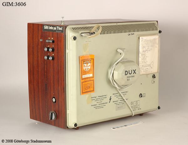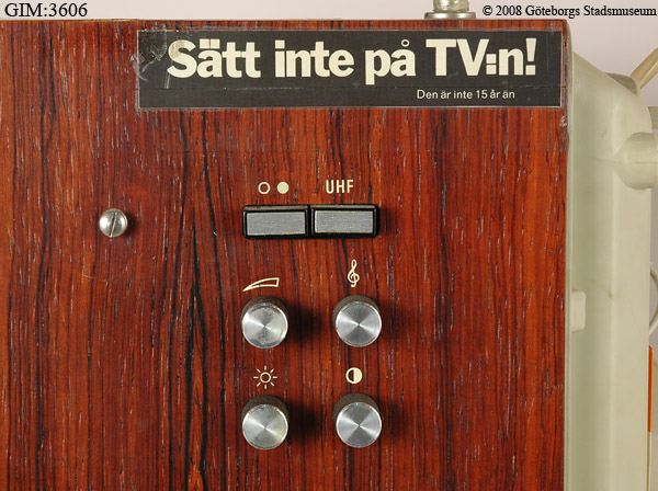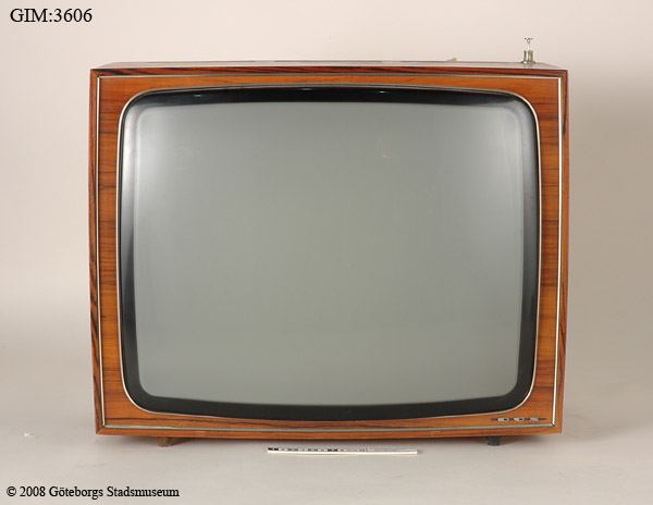 Resetv trächassi, bärhandtag, VHF 1 och 2 och UHF, teleskopantenn, bildrör 19" svartvit. Trasig och lös antenn. På TV:s baksida finns ett garantikvitto på tre månader från Philipskoncernens serviceföretag Servex. där finns även ett kolppingsschema.