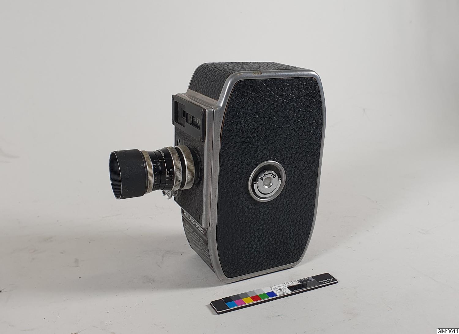 • Smalfilmskamera 8 mm dubbel åtta. Optik: Kern Paillard Yvar 1:2,8 t= 12,5 AR no. 146451. Filmhastigheter: 12, 16, 24, 32