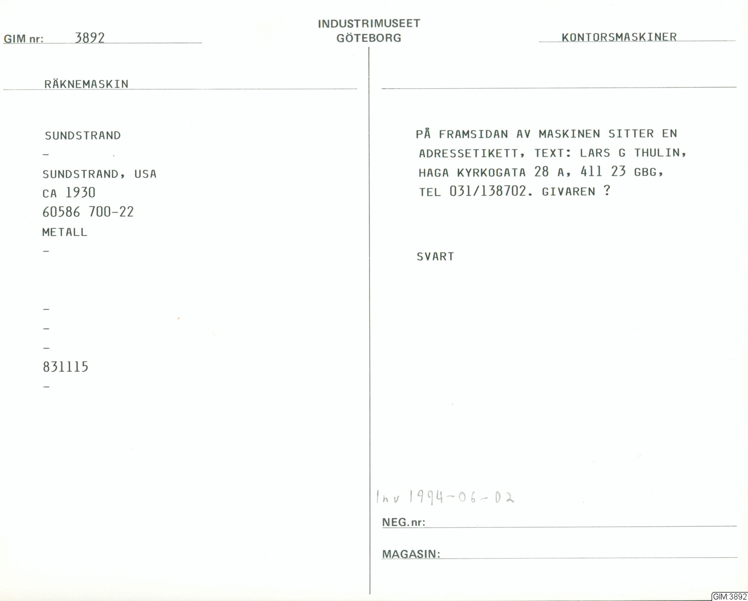 • På framsidan av maskinen sitter en adressetikett, text: "LARS G THULIN HAGA KYRKOGATA 28 A 411 23 GÖTEBORG. tel: 031-13 87 02.