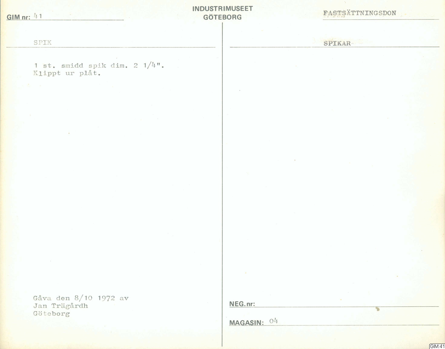 • 1 st smidd spik dim. 2 1/4" (klippt ur plåt?)