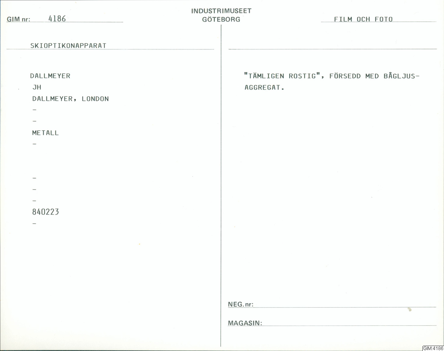 • Skioptikonapparat. Försedd med bågljusaggregat.