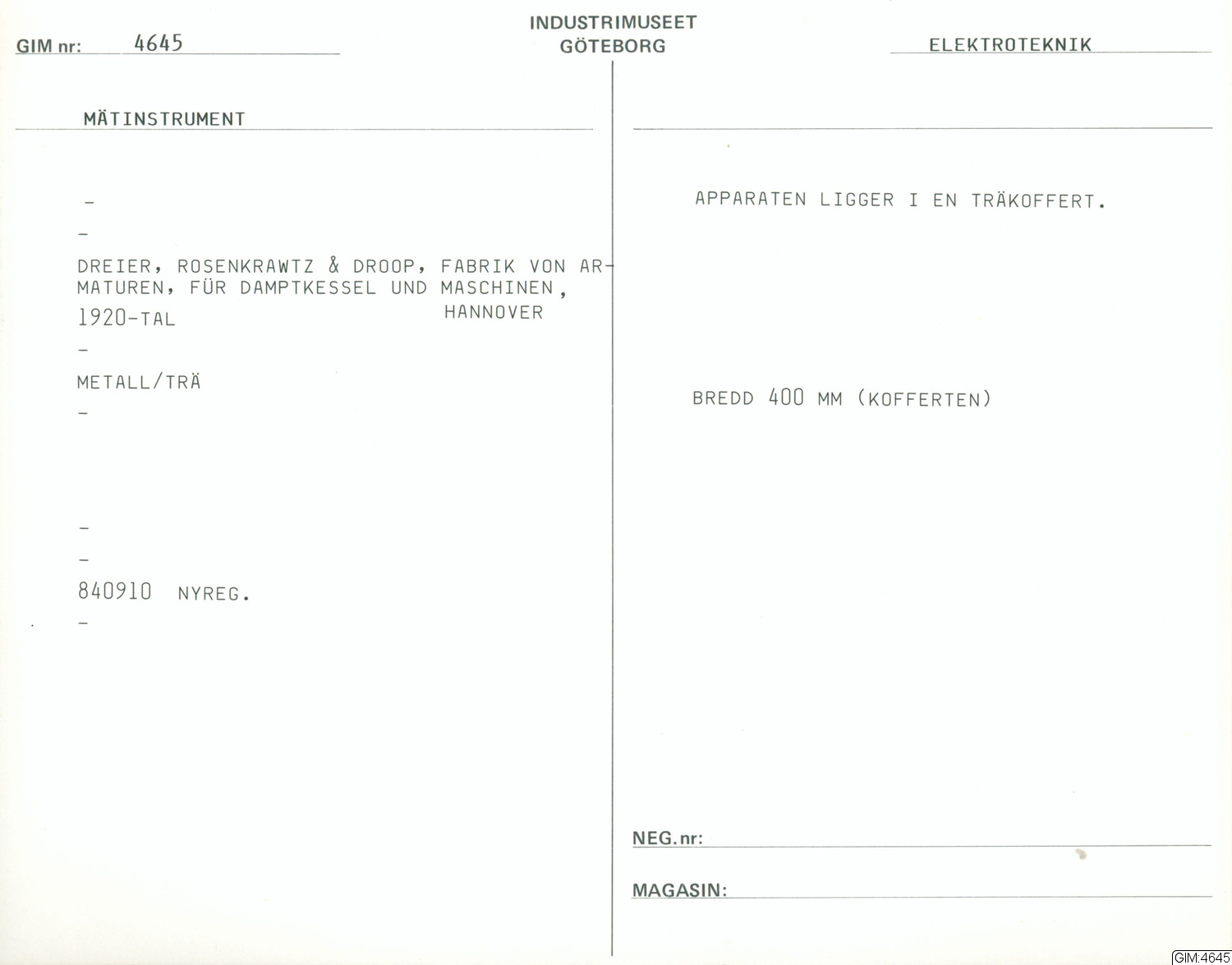 • Fabrik von Armaturen für damptkessel und maschinen. Apparaten ligger i en träkoffert.