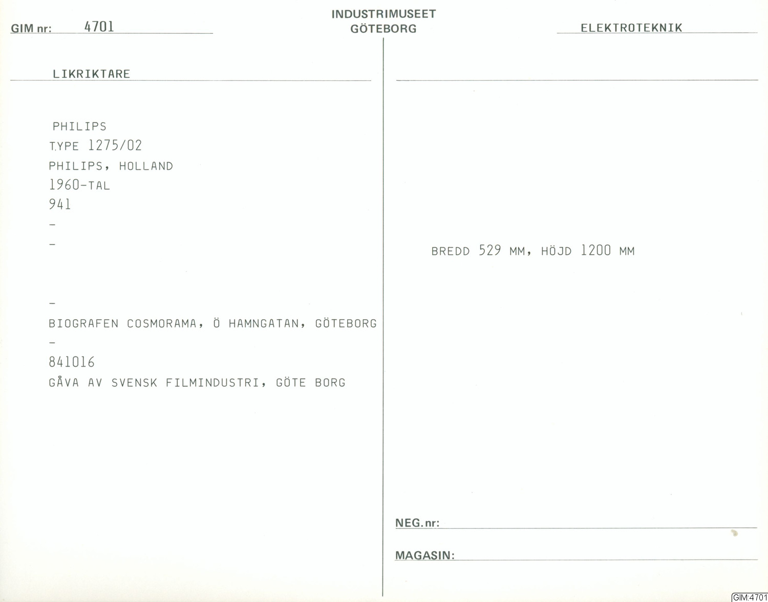 • Har använts på biografen Cosmorama, Östra Hamngatan Göteborg.