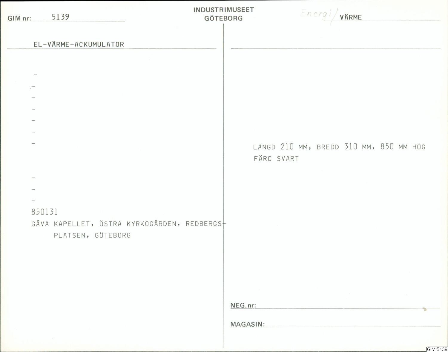 • Förvärvad 1985-01-31 i Göteborg, Sverige av Östra kyrkogården, Kapellet.