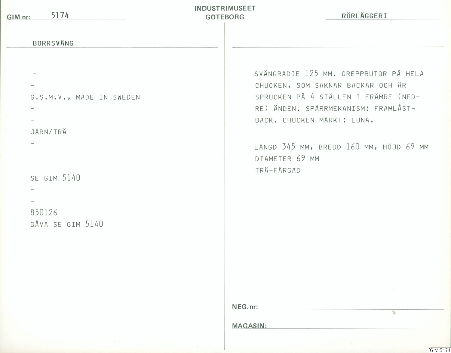 Trä-färgad borrsväng med en svängradie på 125 mm. Grepp-rutor på hela chucken, som saknar backar, och är sprucken på 4 ställen i främre (nedre) änden. Spärrmekanism: fram-låst-back. Chucken märkt : LUNA