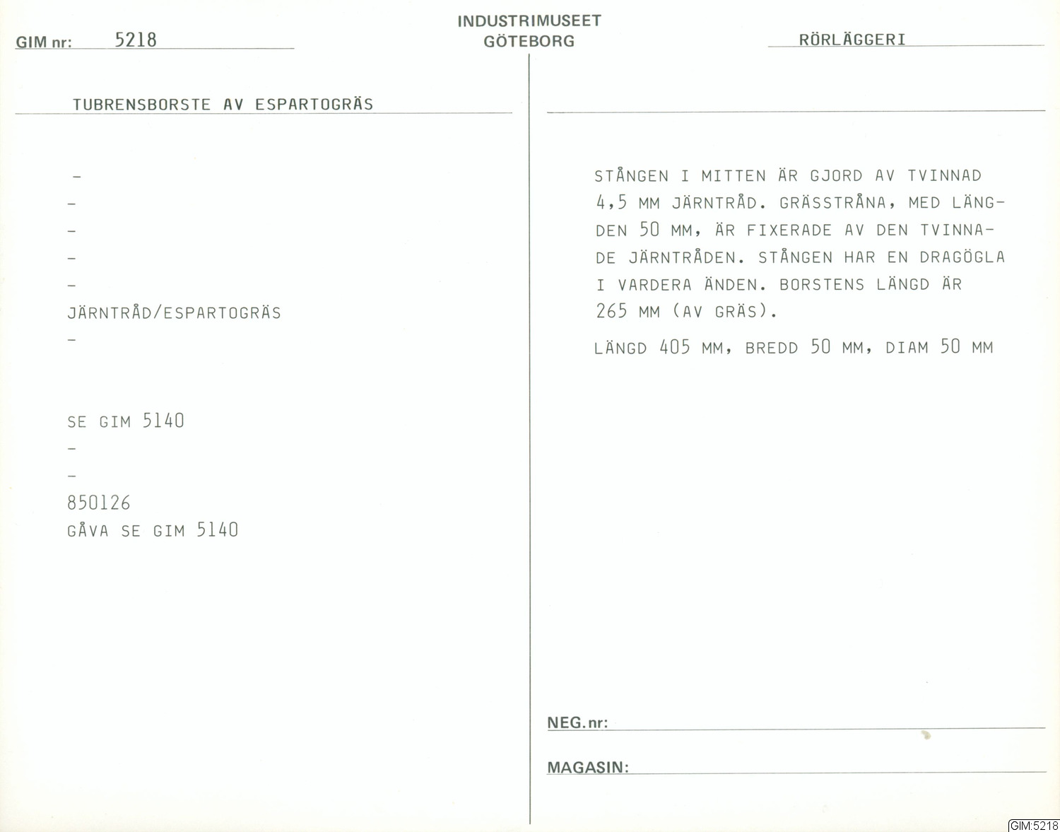 Tub-rens-borste av esparto-gräs. Stången i mitten är gjord av tvinnad 0,45 cm järntråd. Grässtråna, med längden 5 cm, är fixerade av den tvinnade järntråden. Stången har en dragögla i vardera änden. Borstens längd är 26,5 cm (av gräs).