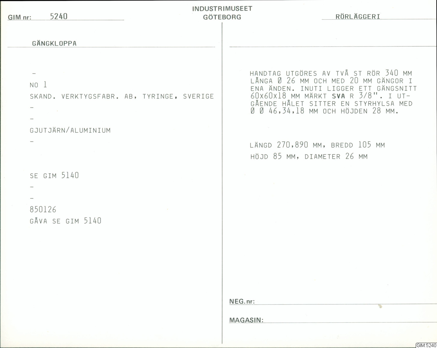 Gråfärgad gäng-kloppa. Handtaget utgöres av två stycken rör 34 cm långa och 2,6 cm diam och med 2 cm gängor i ena änden. Inuti ligger ett gäng snitt 6x6x1,8 cm märkt SVA R3/8". I utgående hålet sitter en styr-hylsa med diametrarna 4,6, 3,4 och 1,8 cm och