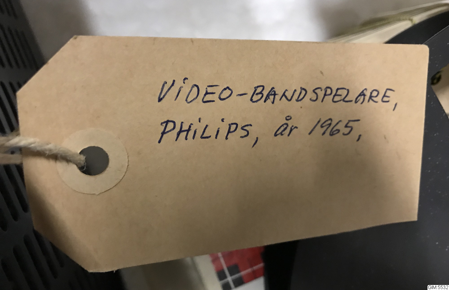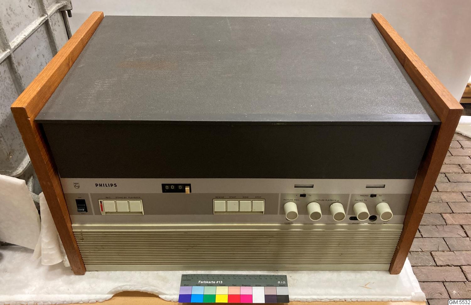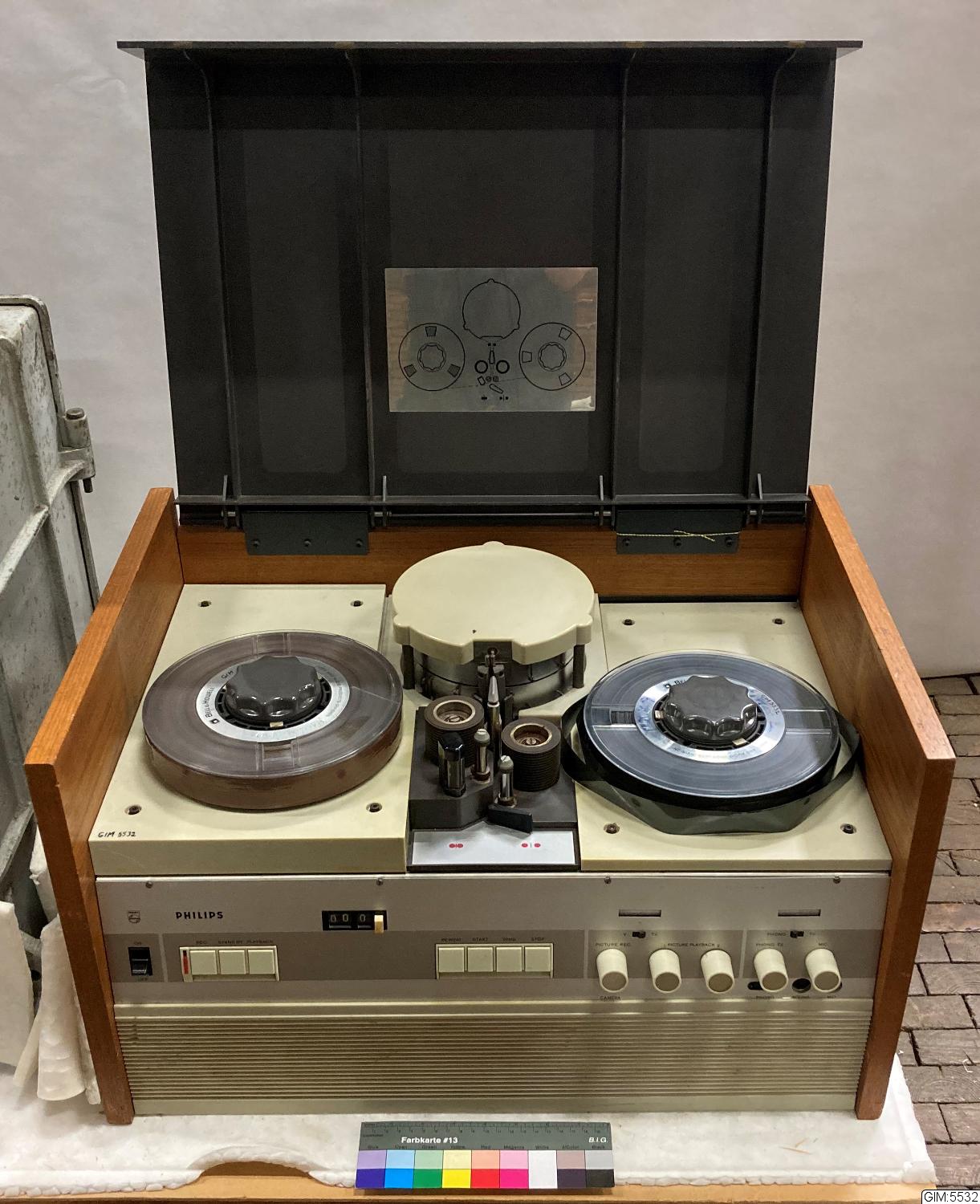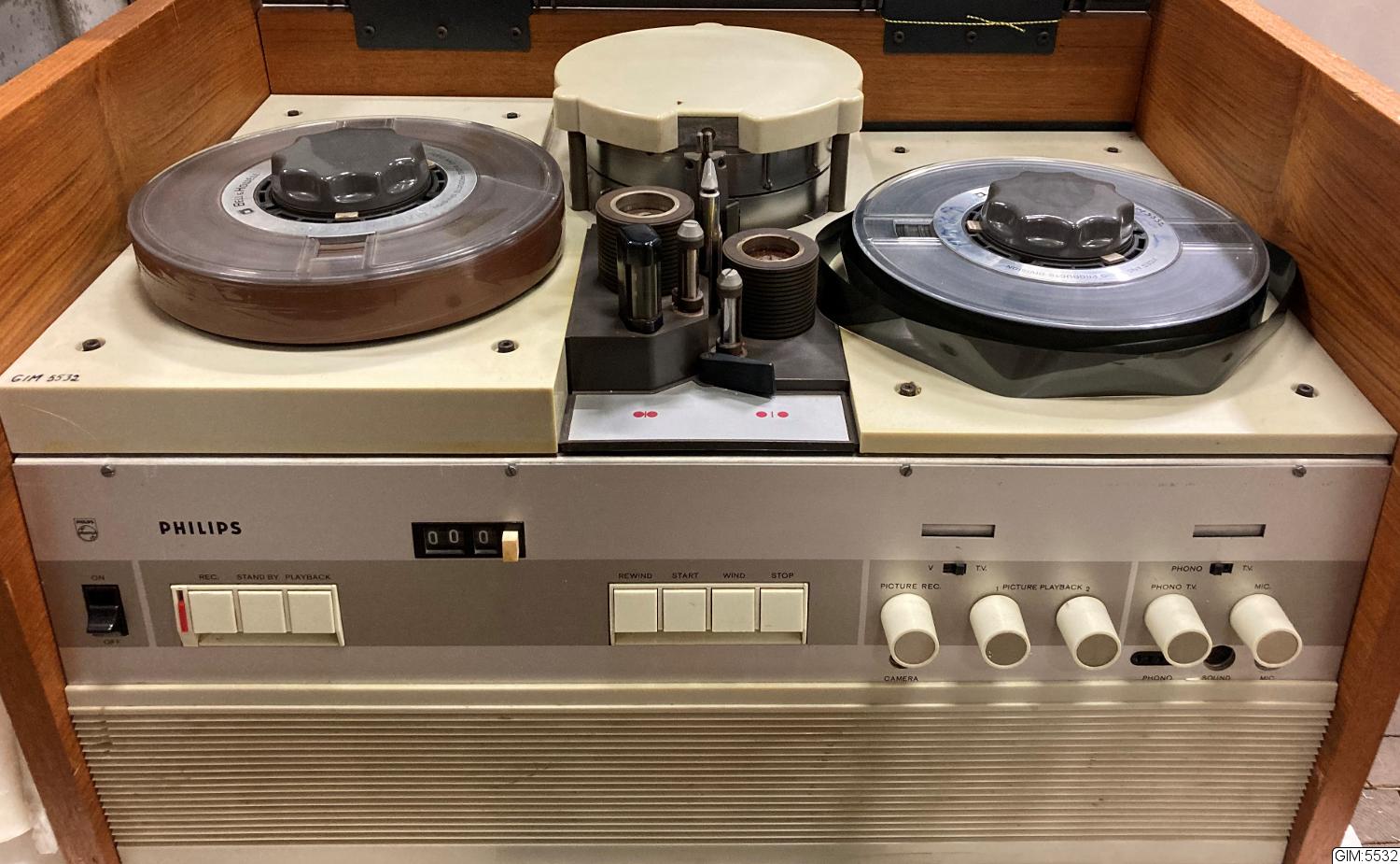 En av de första hemvideorna, rullbandspelare, med radiorör. Endast för svartvit TV, fungerande. Typen användes främst i skolorna. Plastlock, trä och metall hölje.