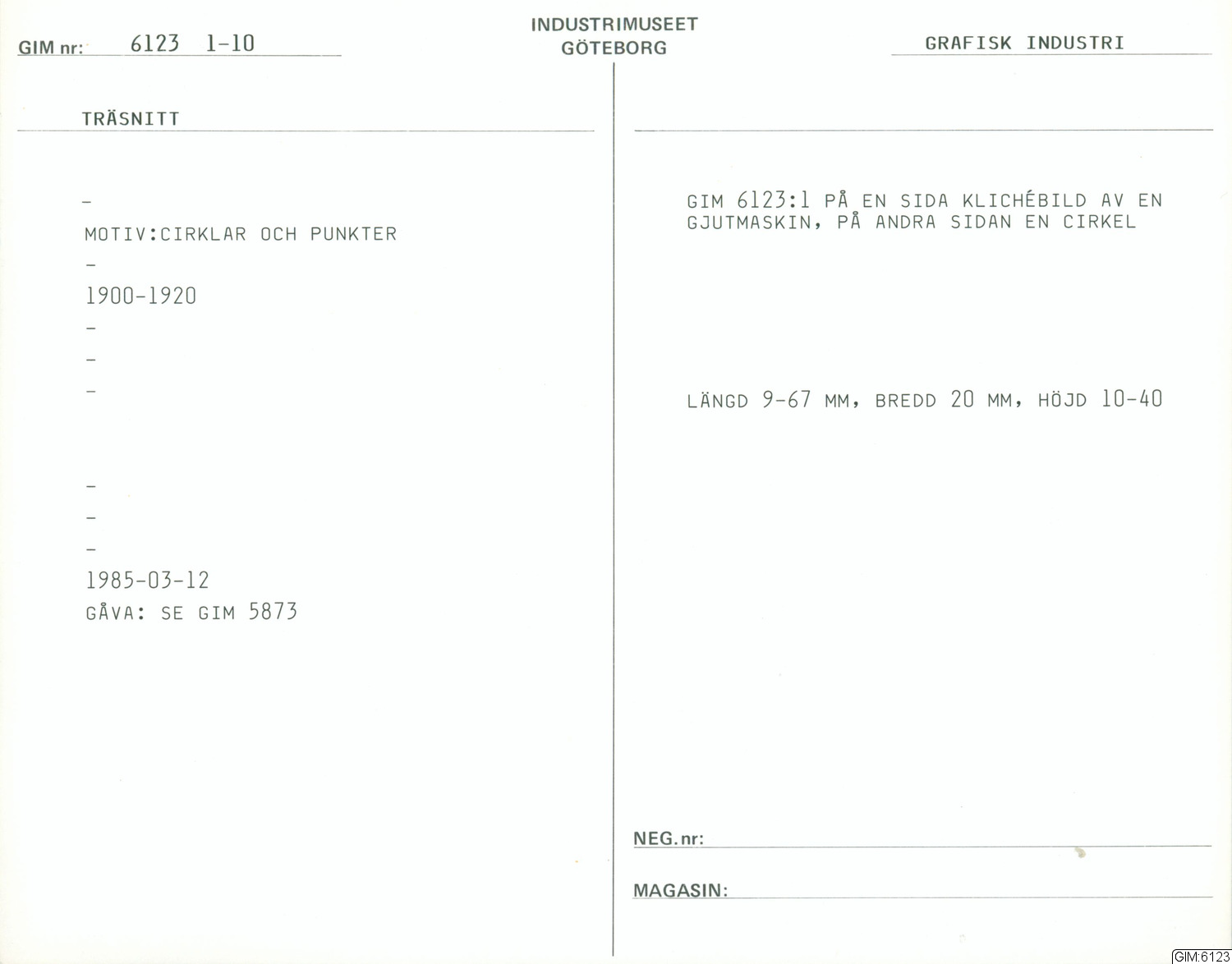 • Träsnitt= xylografi. Motivet: Cirklar och punkter. GIM 6123:1 på en sida klichébild av en gjutmaskin på andra sidan en cirkel.