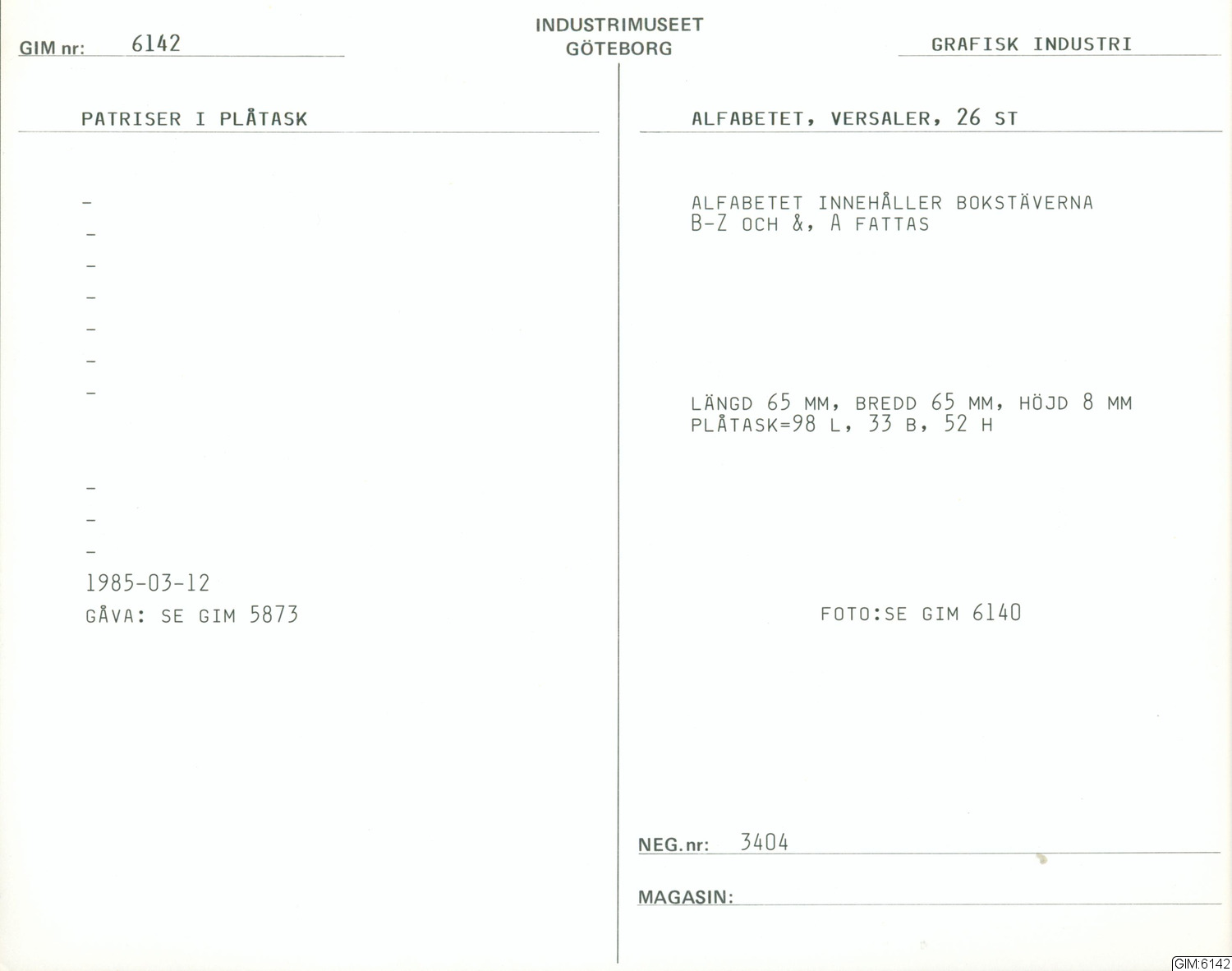 • Patriser-alfabetet B-Z och &-bokstaven A fattas . Förvaras i plåtask som är 9,8 L- 3,3 B- 5,2 H cm.