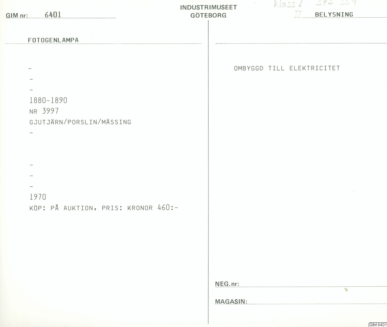 • fotogenlampa ombyggd till elektricitet utlånad till Skara