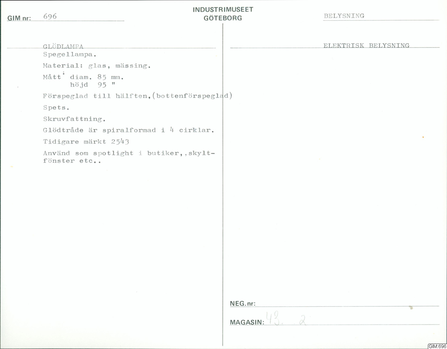 • Till hälften klar, hälften silver-färgad, botten förspeglad, skruvfattning, spets, glödtråden är spiralformad i 4 cirklar, tidigare märkt 2543.