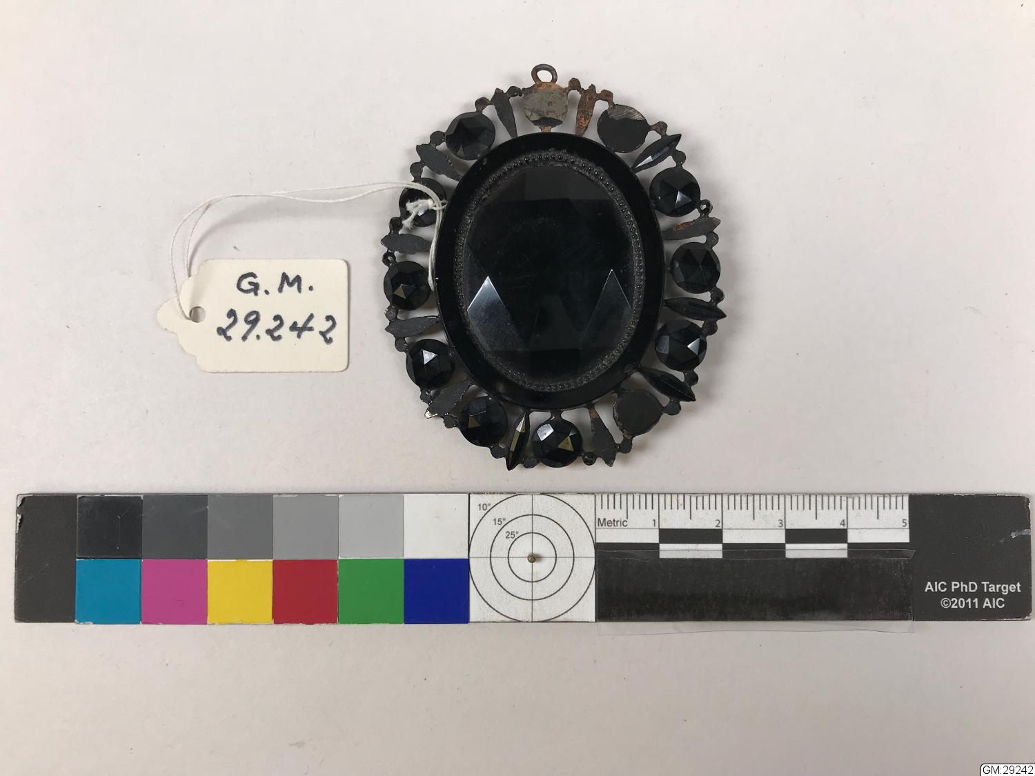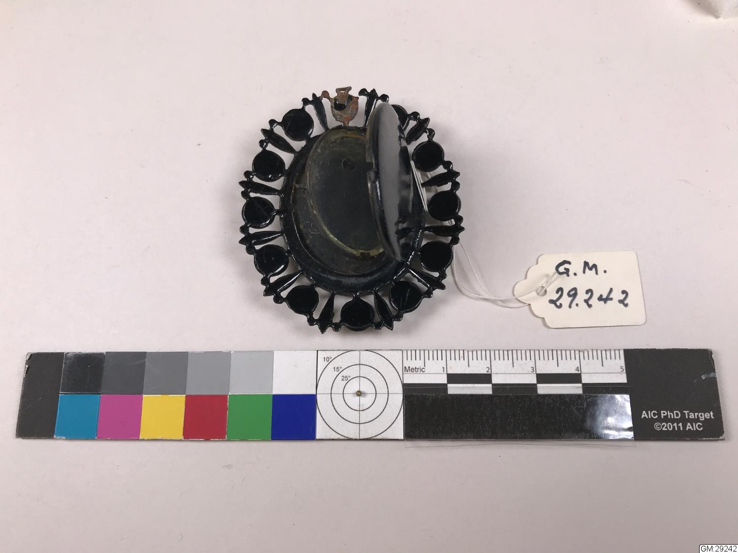 • oval svart medaljong facetterad framsida och utrymme för bild eller annat minne, exempelvis hårlock, på baksidan.