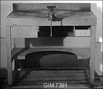 • Grönmålad plåt med skruvstycket fastskruvat. Märkt "GHW". Två draglådor i bordet, en mindre och en något större. Bordsytan är av kryssfanér och övriga delar är av metall.