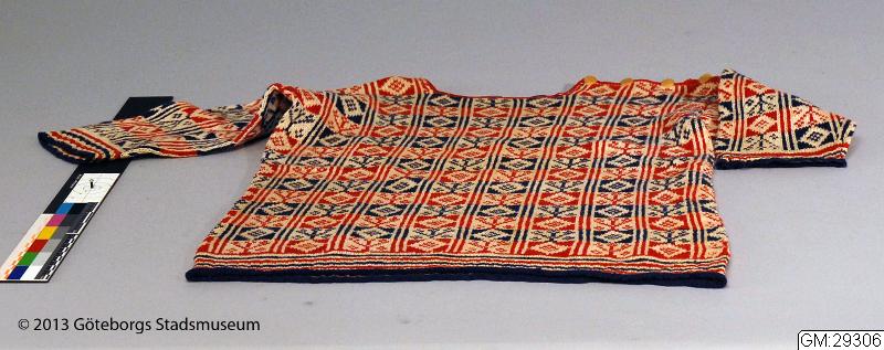Handstickad barntröja (jumper) ev. på stickmaskin, mönsterstickad barntröja i rak modell, rundstickad med fyrkantig halsringning , knäppning på vänster axel, 4 knappar och knappslå. Isydd kort ärm. Tröja och ärm avslutas nedtill med resårstickad randig tråd. Material: bomullsgarn i färgerna rött- vitt- blått. Mönster ger ett rutigt intryck uppdelat i ränder, omväxlande med ställda vita rutor på röd eller blå botten, röda och blå grenar på vit botten.