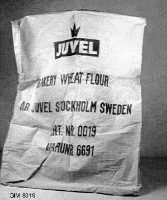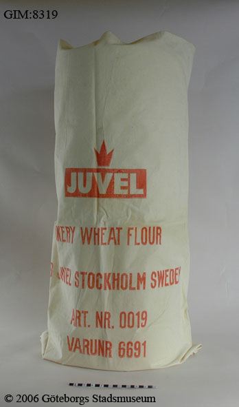 • Vit bomullssäck med röd text: "Juvel Bakery Wheat Flour AB Juvel Stockholm Sweden Art.Nr. 0019 Varunr 6691