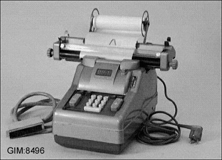 Räknemaskin som ska kopplas ihop med stansmaskin GIM 8497. Grålackerad, färgbandet rött och svart. Skrivvalsen bred, papperet som sitter i är 70 mm brett. Kablage. Dessutom märkt med tusch 308 och en gul dymotejp som har texten maskin 2. Har en grå huv i