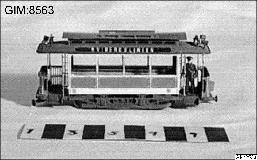 Modell av Göteborgs Spårvägars släpvagn 1903, typ S3. Ex 91. Linje 7, med konduktör, brun platt frontskylt på taket "Kviberg", likadan akterskylt "Olkskrokst". Brun lineskylt på takets långsida "Kvibergslinjen"