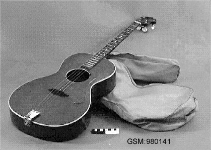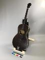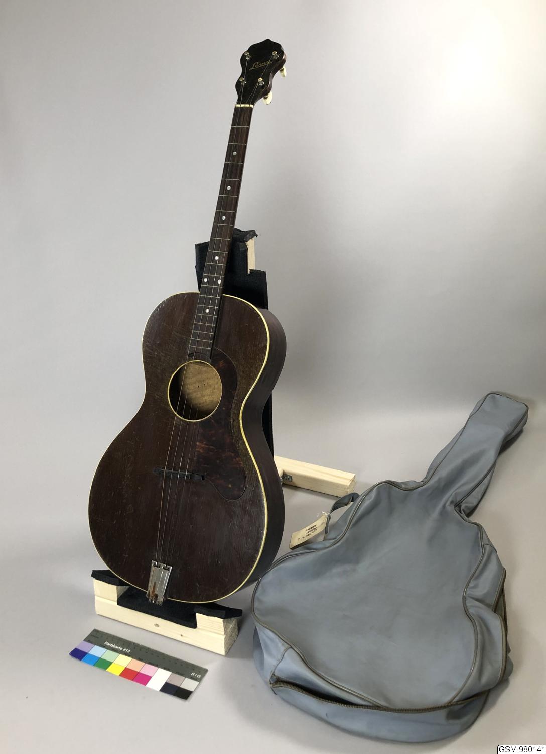 fyrsträngad tenorgitarr, den första "bättre modellen. Lock av gran, Botten och sarg av flammig lönn. Mörkbrun halvglänsande lack. Smal greppbräda av jakaranda med 19 metallband samt 7 runda markeringar av pärlemor. På skruvlådan 4 stämskruvar av vit plast, bakåtriktade. Med skrivstil i guld "Levin"Locket har gulvit plastförstärkning utmed sargen samt kring det runda ljudhålet. Stallet av ebenholtz...