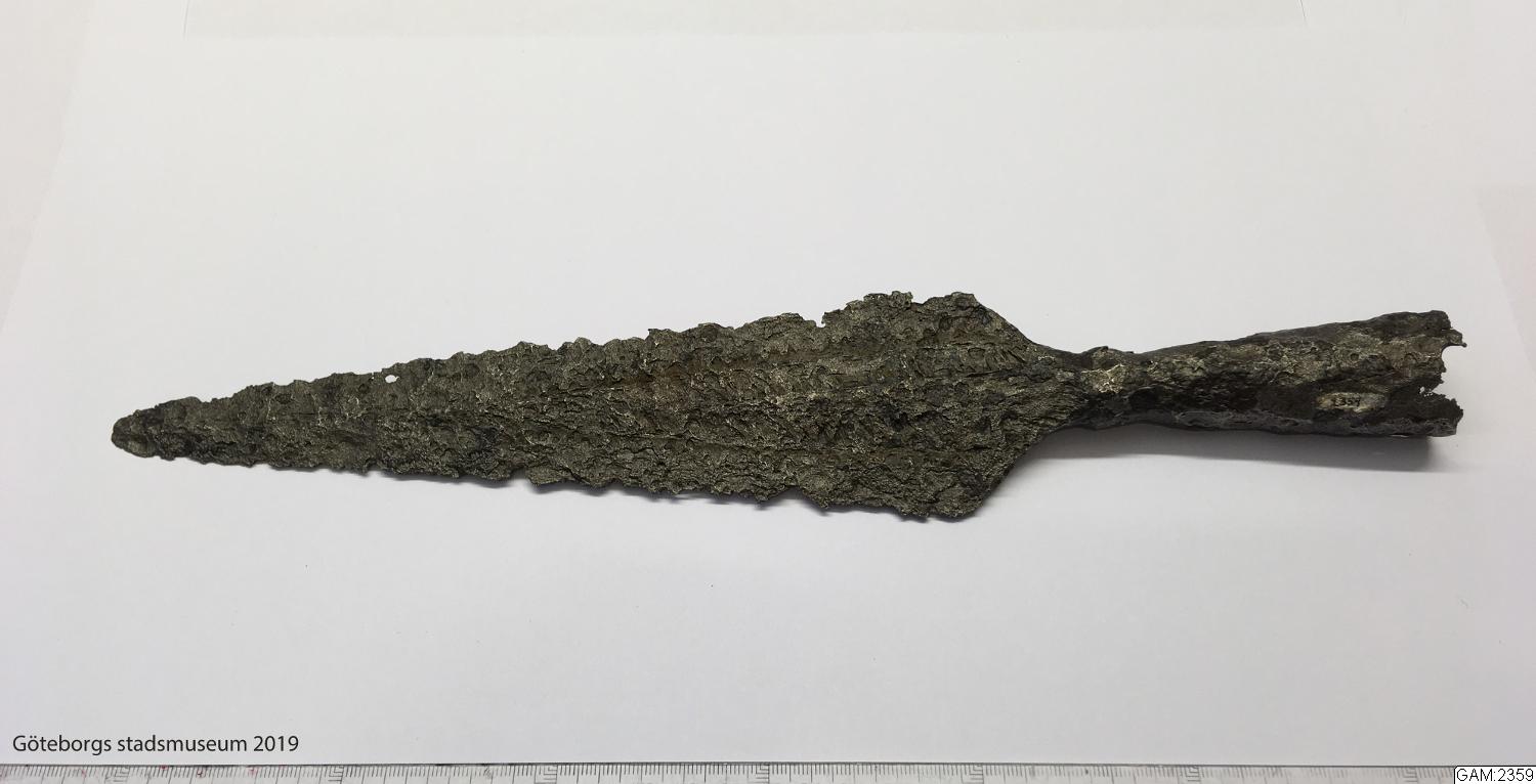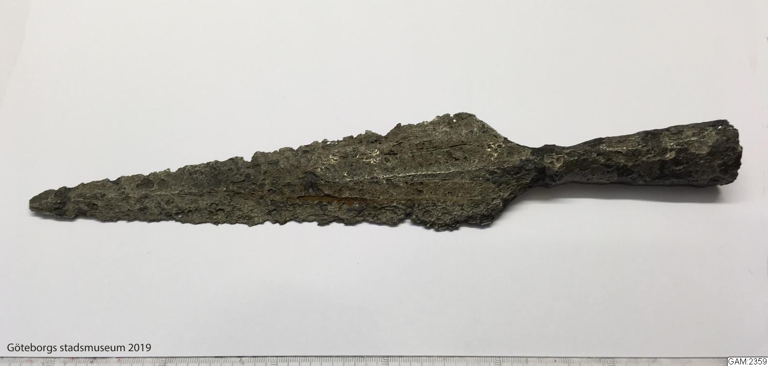 Comments on the construction of the spearhead: The conical socket was attached to the spear shaft by means of two nails, one of which survives, the other one left a hole 4 mm in diameter. The nails are aligned with the blade. The socket was made out of a sheet of iron welded along a line in a plane roughly perpendicular to the holes. No visible decorations are left on the socket. The socket walls are at least 2.1-2.4 mm thick, but it is possible that they are thicker: the pitting is deep in places but no holes are visible. It is possible that the socket was usually polygonal (octagonal?) as it seems to present in places flat-ish surfaces, but the state of the metal makes it difficult to judge whether this was the original shape, or a result of corrosion/conservation. A polygonal socket would be quite exceptional for a Type H spearhead. A bulge, typical of Type H spears, is visible at the junction between the socket and the blade. The hollow inside the socket is 95 mm deep. This is exactly the length of the socket plus the bulge, so the weld attaching the socket to the blade is presumable either in the bulge (hidden under it?), or after it. Deep lines run just after the bulge but these might be a result of conservation work rather than signs of the welding line. The blade has a composite construction, made of 7 different elements of metal (possibly only 4 if all the outer elements are bent around rather than made of two pieces). The core, of layered (folded) iron, is 10-12 mm wide, and about 12 cm long (from the base of the blade) - it extends about 9 cm further than the shoulder of the blade. The second layer, 30 mm wide at the shoulder of the blade, is made of twisted pattern-welded rods. The direction of the twist is the same on both sides of the blade, rather than symmetric. The number of layers in the twisted rods was not determined, and the surface preservation near the base of the blade made it impossible to say whether the end of this layer was forged to shape or ground. The third layer is a wolf-tooth pattern, of homogeneous metal. The toothed bands are about 5 mm thick, and the teeth are about 3 mm high and spaced by 5 mm. The last layer is the edge, of layered (folded) metal, presumably steel rather than iron. The lines of the metal, flowing around the wolf-tooth pattern, show clearly that the edge was forged onto the pre-formed teeth (rather than a iron rod being forged onto teeth pre-formed in the steel band). The layered edge shows signs of delamination in several places. The cutting edge itself is preserved nowhere, and the remaining, corroded edge is damaged (bent) in several places, but it is impossible to know whether this damage precedes the corrosion process or not. The blade has a simple diamond cross-section, with simple bevels. The ridge is offset by about 1 mm from the middle of the spearhead on all its length (save for the tip), but is well-aligned with the socket. While such an asymmetry is far from abnormal, it is possible (given the shape of the blade and the corrosion state of the edges) that one edge is more corroded than the other. The blade is slightly bent (with an offset of 7 mm with respect to a perfectly straight line), the bend starts about 9 cm from the tip of the blade. Again it is impossible to tell whether this happened before or after deposition - although a bend happening during the use of the weapon might have rather happened closer to the point./Dr Jan Orkisz 2019-12-02