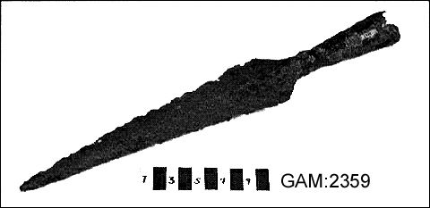 Comments on the construction of the spearhead: The conical socket was attached to the spear shaft by means of two nails, one of which survives, the other one left a hole 4 mm in diameter. The nails ar...