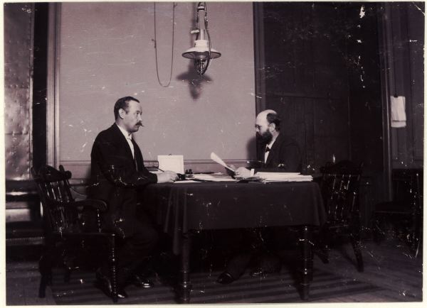 Sterbhuskammaren, 1895 t.h. kammarskrivare O. A. Selldin. Obs! man eldade med ved - luckorna för fönstren stängdes vid arbetets slut för att hålla värmen inne. uppg. av frk Helfrid Selldin, Eklandagatan 29 b, Göteborg (tel. 16 30 23).