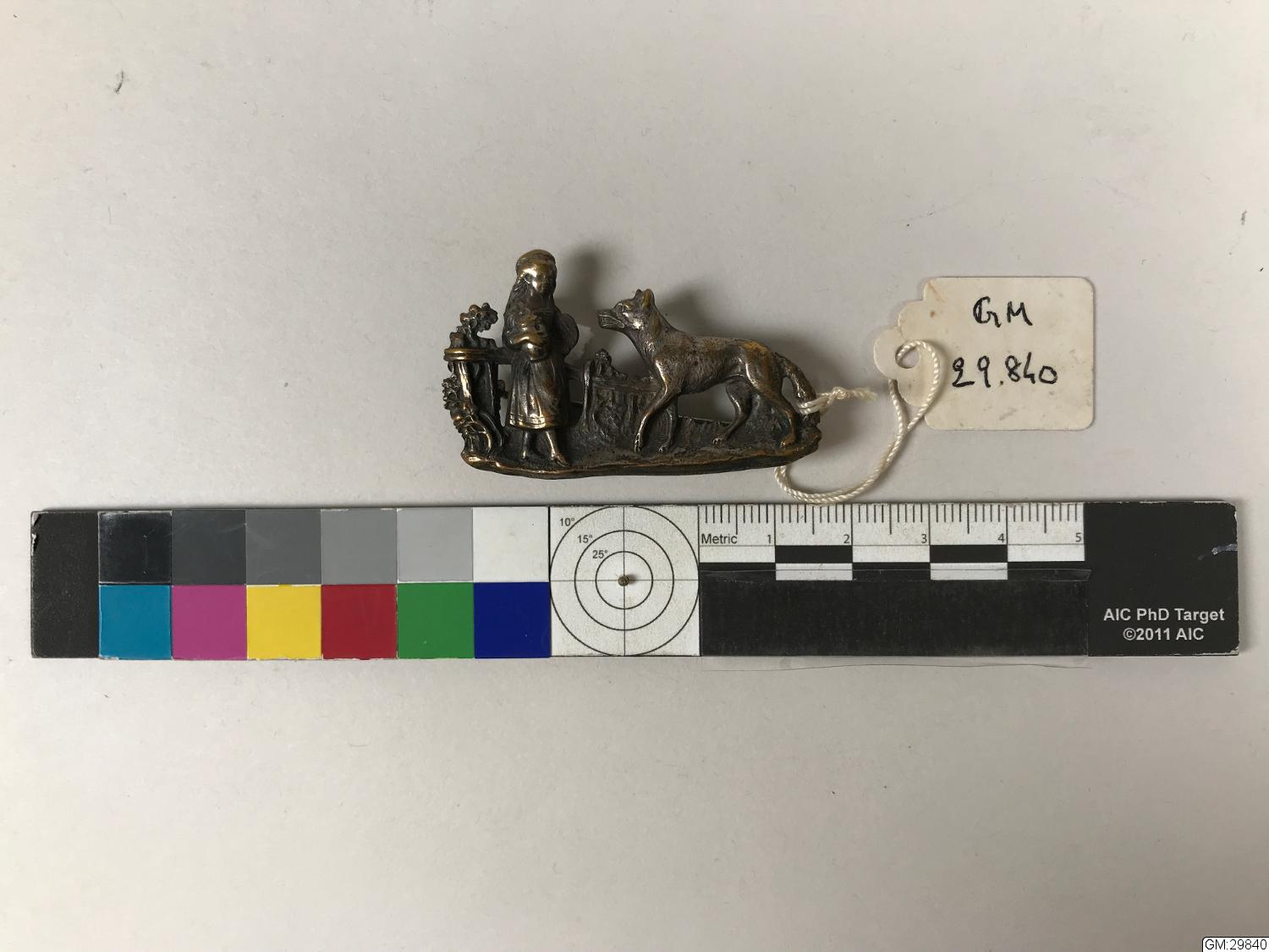 • Brosh av pressad patinwrad gulmetall motivet möjligen från sagan "Rödluvan och vargen"