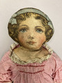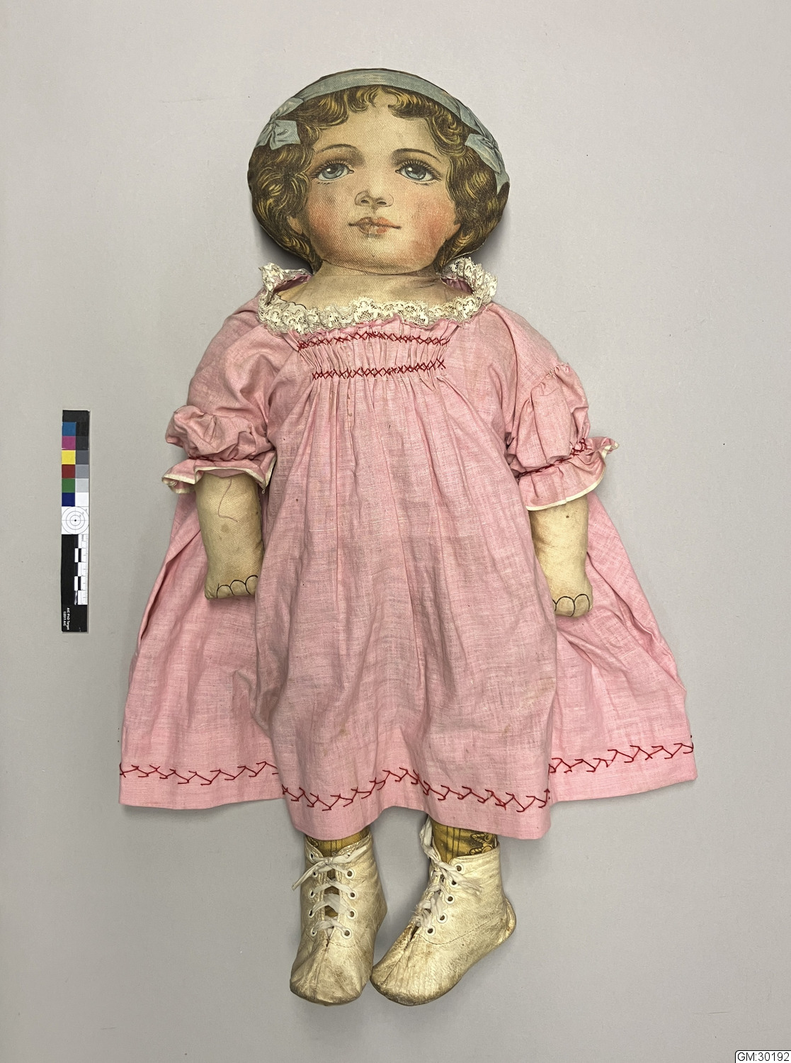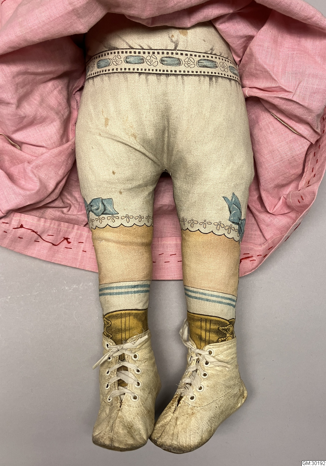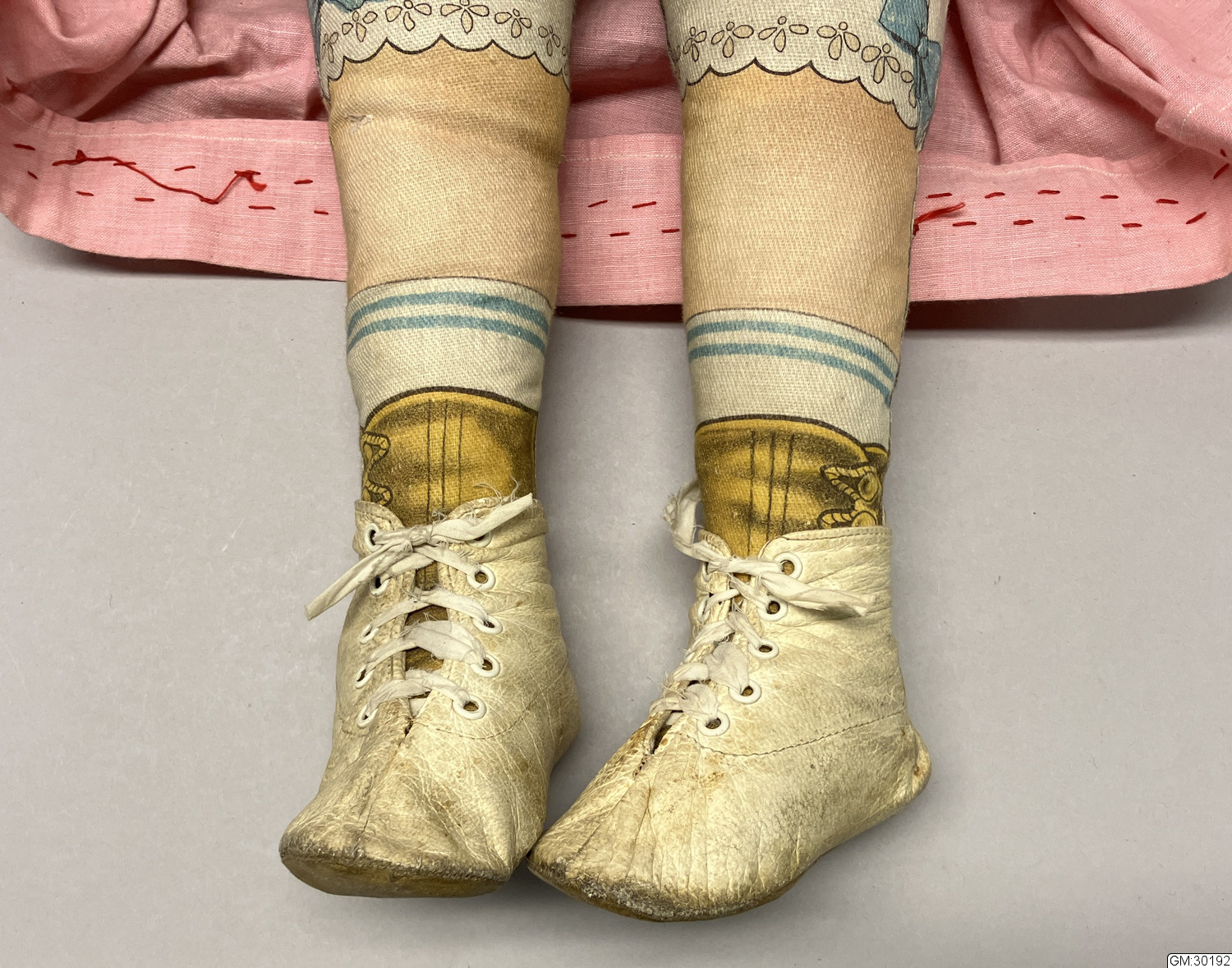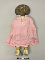 Docka av tyg med rosa klänning och vita snörkängor av skinn. Dockans ansikte och underkläder är tryckt på dockans tyg. Tyget har sannolikt tryckts i kuponger(rapporter) med en framsida och en baksida per styck, som sedan såldes så att köpare själv sydde samman och stoppade dem så att det blev en docka. Exempel på sådan försäljning finns i GSMArkiv:150370 (en postorderkatalog från 1923) på sidan6...