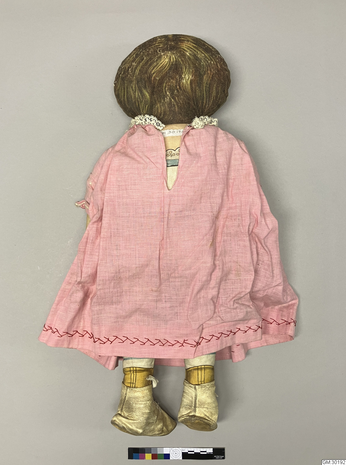 Docka av tyg med rosa klänning och vita snörkängor av skinn. Dockans ansikte och underkläder är tryckt på dockans tyg. Tyget har sannolikt tryckts i kuponger(rapporter) med en framsida och en baksida per styck, som sedan såldes så att köpare själv sydde samman och stoppade dem så att det blev en docka. Exempel på sådan försäljning finns i GSMArkiv:150370 (en postorderkatalog från 1923) på sidan63 erbjuds just en sådan tygkupong att själv sy en docka av. Gunilla Andersson 2015-12-14