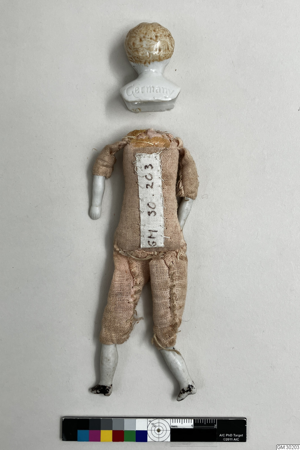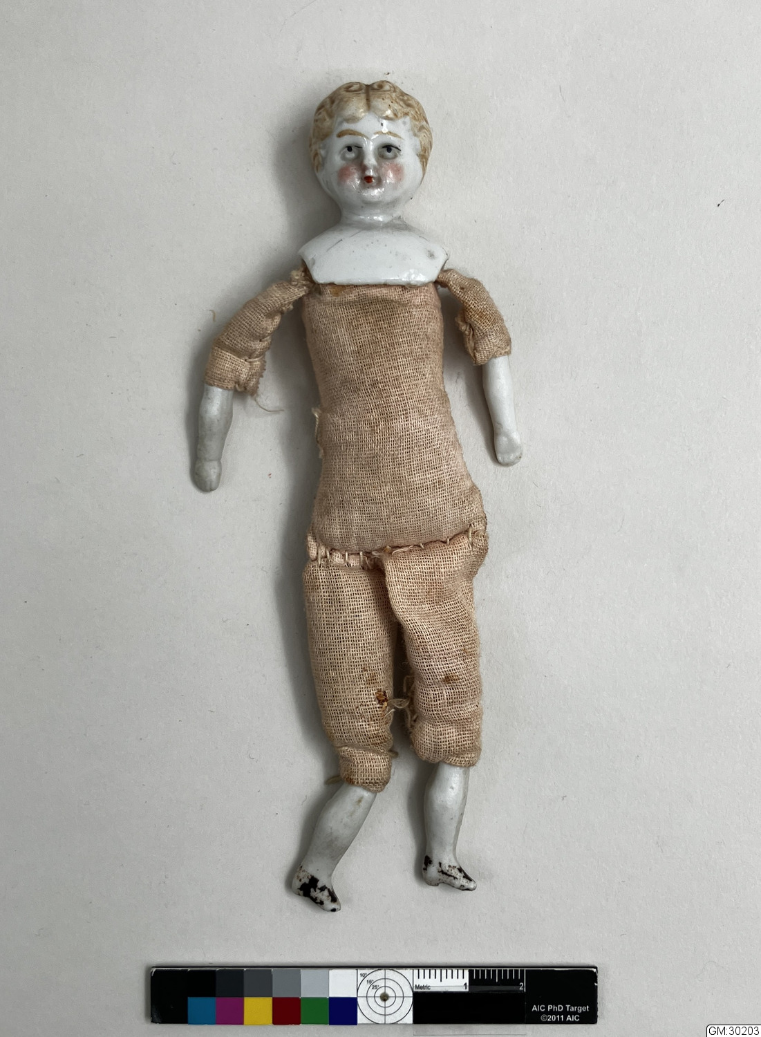 • Liten docka med stoppad kropp och huvud, ben och armar av porslin. Saknar kläder.