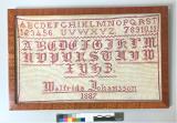 märkduk sydd av Frida Johansson, född 12/10-1875, Norra Larmgartan, Nordstan, Göteborg. Under ledning av handarbetslärarinnan fröken Barkman, skola på gamla Otterhällan. Johansson bodde 1904-39 på Södra Liden 1A, Göteborg. Överlämnad till Skolsamlingarna i maj 1970 av E Rydelius, Kallkällegatan 18, Göteborg.