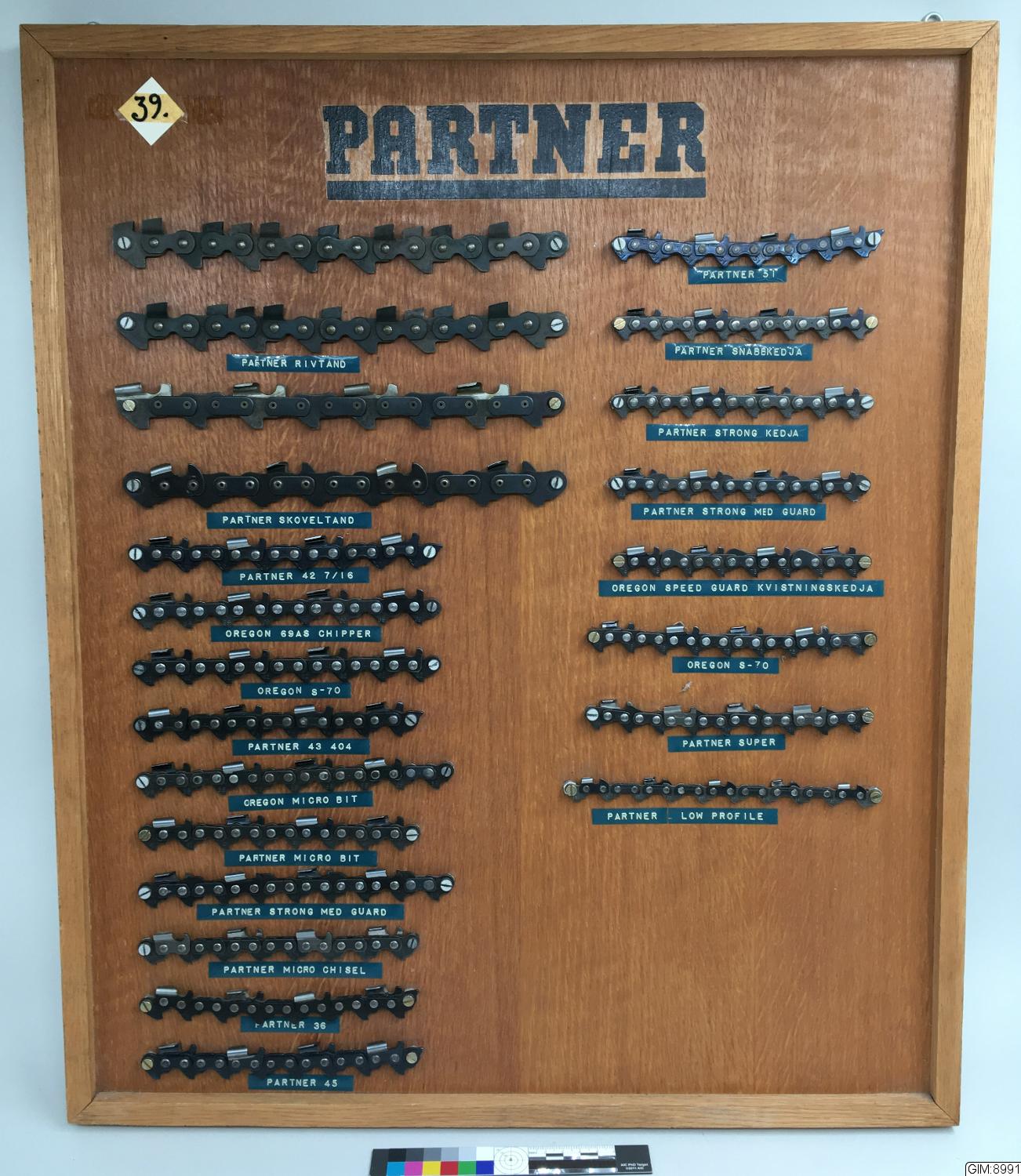 • sågkedjor från motorsågstillverkaren Partner, monterade och inramade med varunamn fäst under. 22 sågkedjeexemplar totalt.
