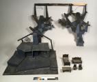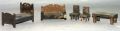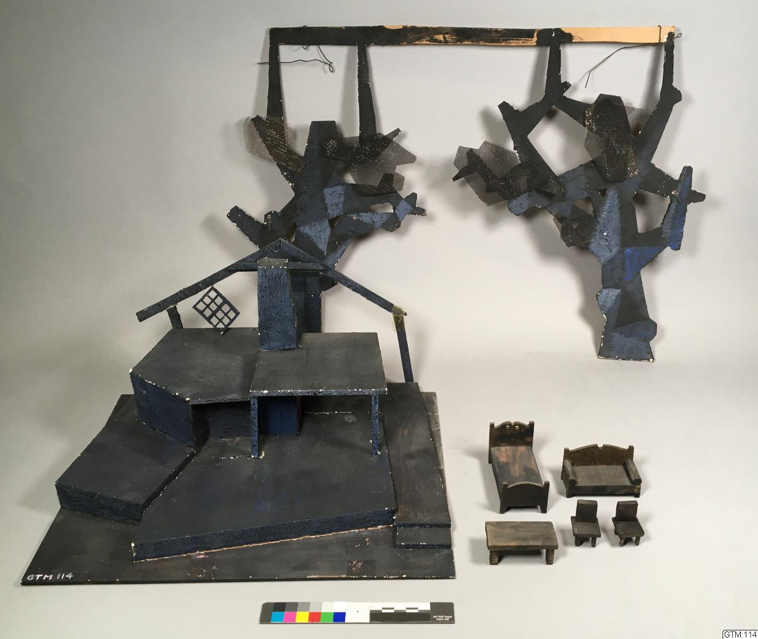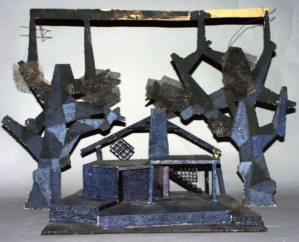 Trappsteg, avsatser till en del av ett hus med platt tak som bär upp av pelare i ytterkant och hörnen, skorsten på antytt tak, två stora trä med kronor, som troligen inramat scenbilden, allt målat i blått. bild_b: bruna möbler som står lösa: säng, soffa, bord och två stolar.