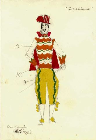 Man i vit, midjekort jacka med tvärgående vågmönster i grönt och orange, vita ärmar med orange uppslag med gröna kanter, kort, rosa-röd mantel, pipkrage, rosa-röd hatt med liten plym, gula knäbyxor med tofsar och grön sick-sack-rand, vita strumpor, skor med gula tofsar. (OBS! skissen beskuren på båda sidor c:a 1 cm vid scanning)